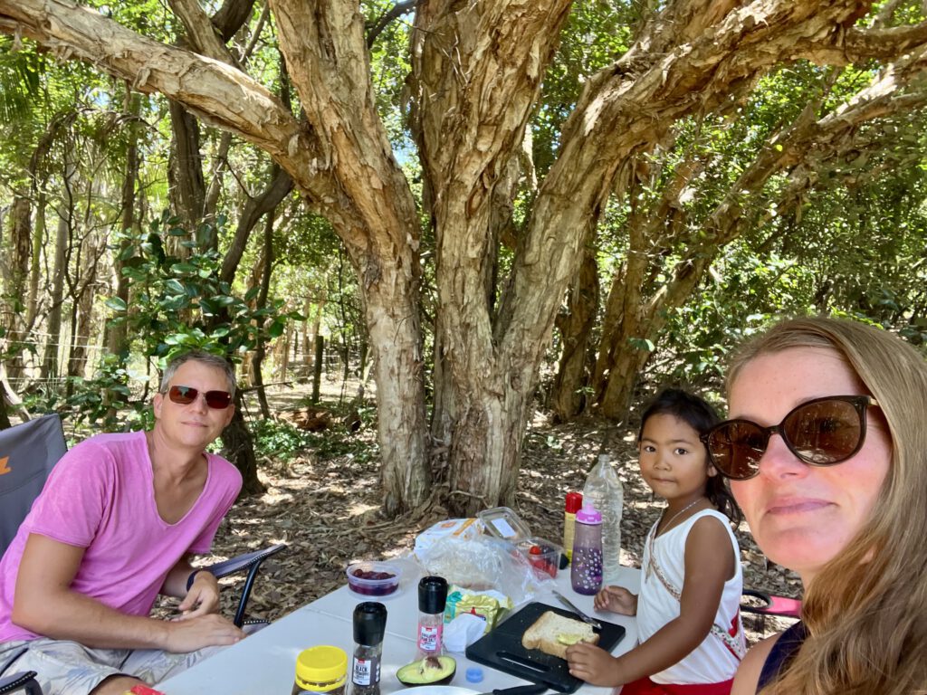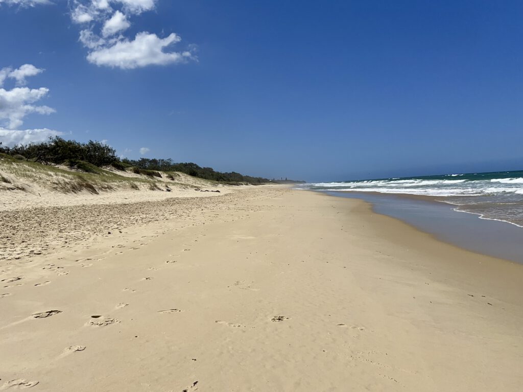 Zum Glück haben wir einen tollen Mittag in Coolum Beach verbracht. Am Ende einer abgelegenen Straße parkten wir unseren Camper, räumten die Campingstühle und den Tisch heraus und aßen leckere Brote am Waldweg hinauf zu einer Düne. Danach ging es an den wundervollen Strand in die wilden und tosenden Wellen. Hier musste Nadcha ihr Body Board im Sand liegen lassen, da an surfen nicht zu denken war. Die Wellen waren einfach zu groß. Wir hatten dennoch viel Spaß. Ich zeigte Nadcha wie man am besten durch großen Wellen taucht und Dank ihrer Taucherbrille war das kein Problem. Wir blieben im Wasser bis die Kräfte schwanden und Nadcha an zu bibbern fing.