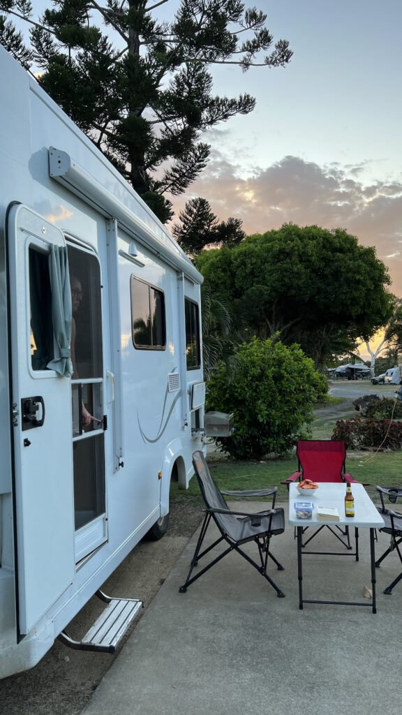 Es gibt keinen Ausdruck der es für mich besser beschreibt – das Gefühl einer totalen Entspannung – to be at ease. Genau das ist dieser Moment, in dem ich an unserem Camper draußen am Grill stehe und unser Abendessen zubereite. Es bruzzelt auf dem Grill, es riecht herrlich, der Wind weht kräftig vom Meer herüber und eine kühle Flasche IPA steht auf unserem Campingtisch. Die Sonne geht hinter den Palmen unter und hunderte Vögel lamentieren lautstark um uns herum – dagegen ist der Hamburger Fischmarkt ein Kindergarten. Genau das ist der Moment – „being at ease“.