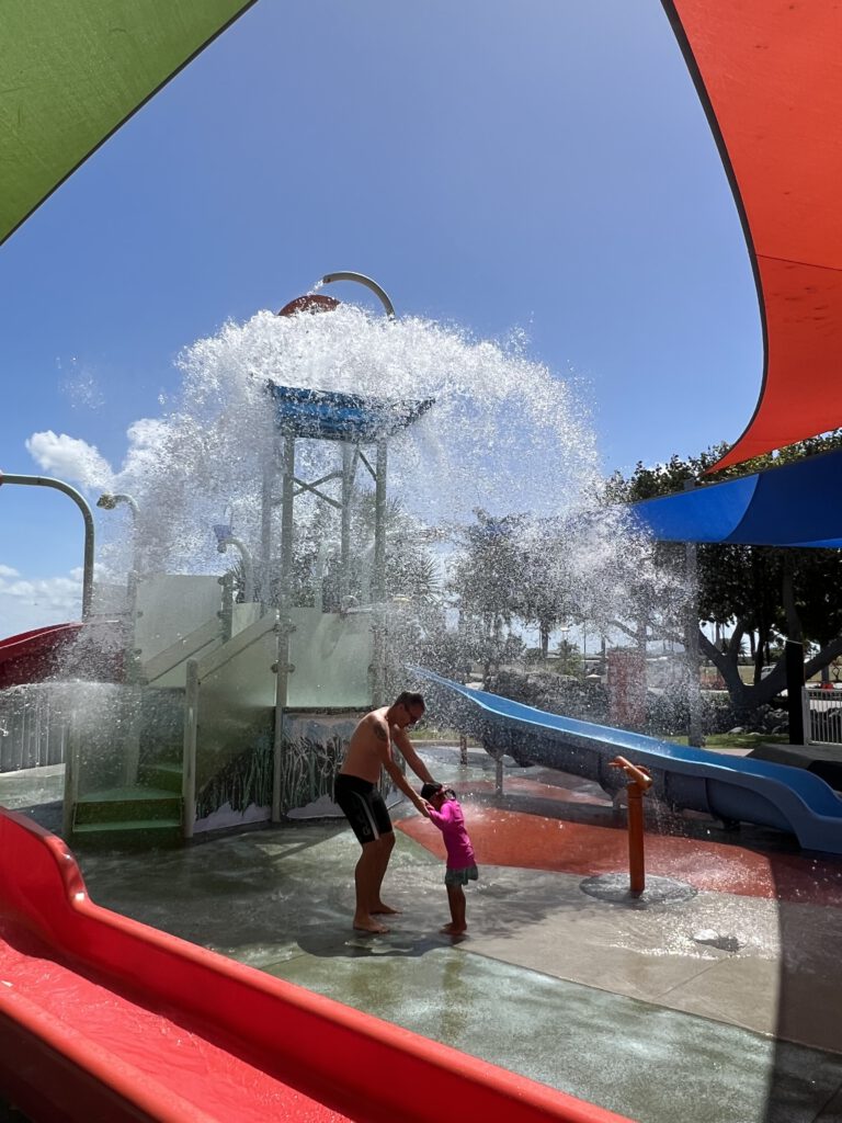 Nadcha war wieder so geduldig, dass sie sich zu dem Eis in der Touristeninfo auch noch Spielen im Wasserpark verdient hat. Bowen bietet einen kleinen Wasserpark an, der per Knopfdruck aktiviert werden kann. Zwei Wasserrutschen und eine riesige Badewanne, die alle paar Minuten ca. 150 Liter Wasser über den gesamten Platz ergießt. Wie soll es anders sein – auch dieser Spass ist hier für umme. Aber das Beste ist, dass wir den gesamten Platz für uns alleine haben. Was für eine Gaudi für jede/n von uns dreien.