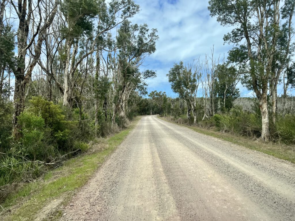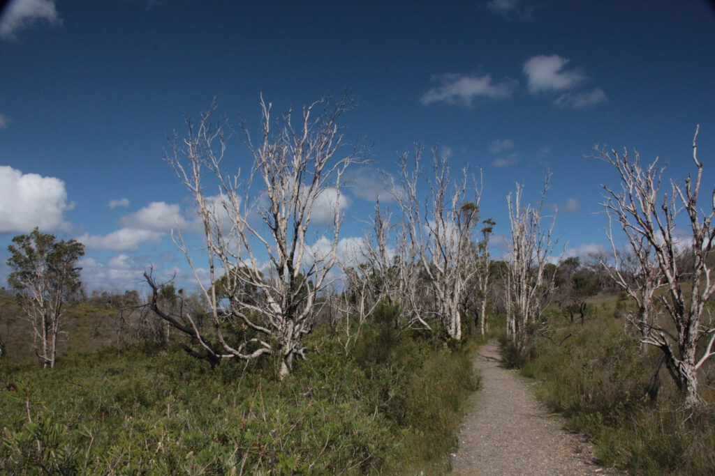 Nachdem uns die Mücken freundlich aufforderten weiter zu gehen, kamen wir schnell aus dem Wald heraus auf weitläufige Flächen. Hier in der Gegend haben in den Jahren 2019/2020 schwere Waldbrände gewütet. Einige Wegabschnitte führten durch gespenstig anmutende Totwälder – abgestorbene Bäume an denen die Spuren der Feuer noch sehr gut zu sehen sind. Dennoch schienen vor allem die Paper Bark Trees dem Feuer stand gehalten zu haben. Hier sprießten bereits wieder neue Treibe und Äste. Die weitläufigen Flächen sind bereits wieder mit Bodendeckern und kleinen Pflanzen übersäht.
