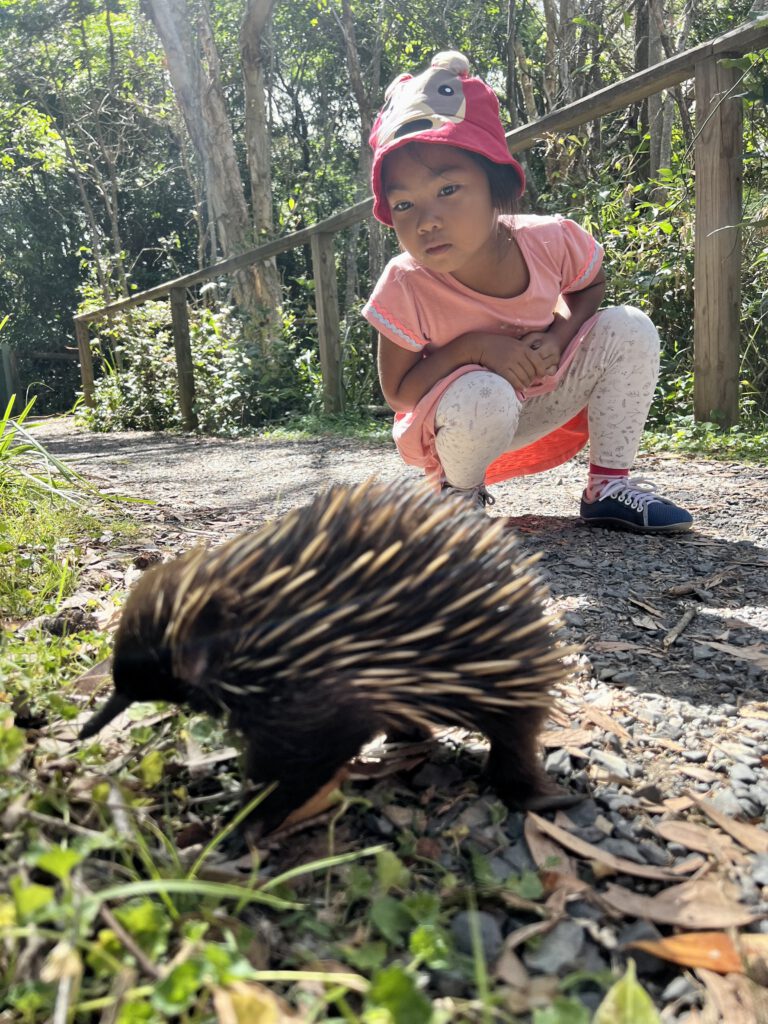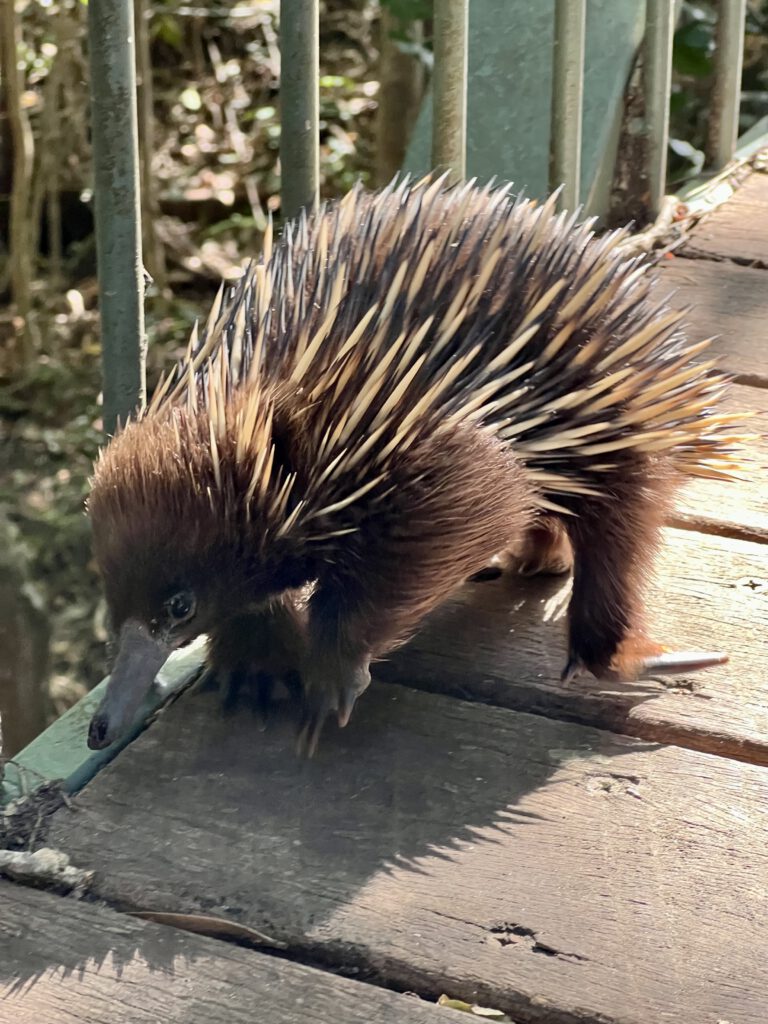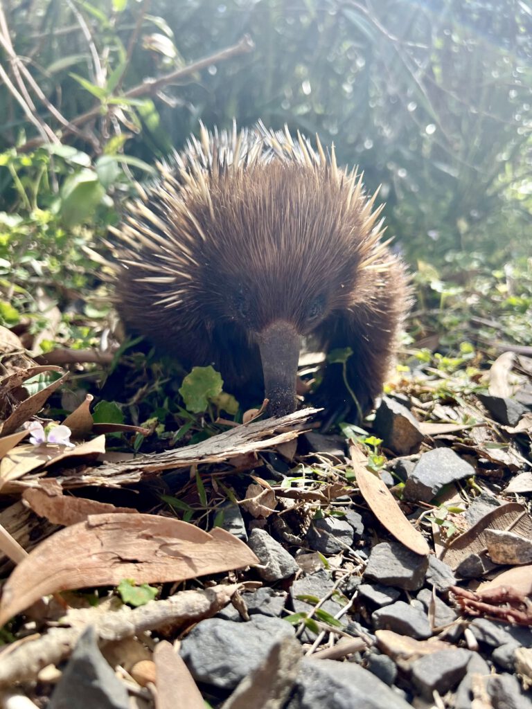 Mit 21°C und einer steifen Briese war es zwar durchaus kühl, aber es war schön sonnig und so machten wir uns sogleich auf zum Mermaid Lookout. Kaum waren wir die ersten paar Meter auf dem Weg hinter dem Camp wurden wir von einem Echidna (Ameisenigel) begrüßt, der gemütlich entlang des Weges auf der Suche nach Futter mit seiner langen Nase im Boden herumstocherte. Genau für diesen Moment haben sich die 19,5km Wellblechschotterpiste bezahlt gemacht. Der Echidna war so entspannt oder konzentriert bei der Sache, dass es ihm absolut egal war, dass er Zuschauer hatte, die sich Schrittchen für Schrittchen auf Zehenspitzen heranpirschten. So konzentriert war er, dass er einfach über Nanettes Schuh drüber lief. Was für ein Schauspiel durften wir hier schon wieder erleben?!