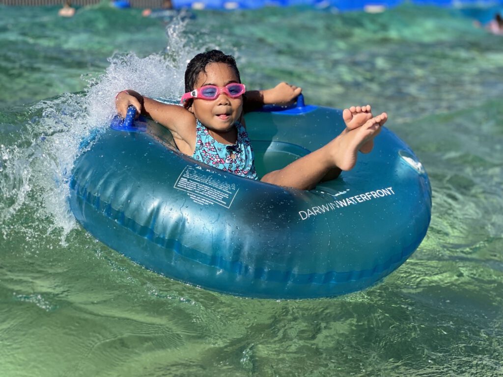 Nach ein wenig Darwin Sightseeing geht es zurück ins Hotel und wir packen unsere Schwimmsachen. Wir haben Glück. Der Pool im Hotel wird renoviert und daher bekommen wir Freikarten für das Wellenbad an der Waterfront. Nadcha ist erneut im Glück. Sie lacht sich kaputt während ich sie in einem Schwimmreifen über die 1m hohen Wellen schiebe. Schnell haben wir den Punkt im Bad ausgemacht, wo die Wellen am wildesten sind. Der positive Nebeneffekt von so einem Wellenbad: Heute hat sie ohne Probleme genug getrunken 🙂