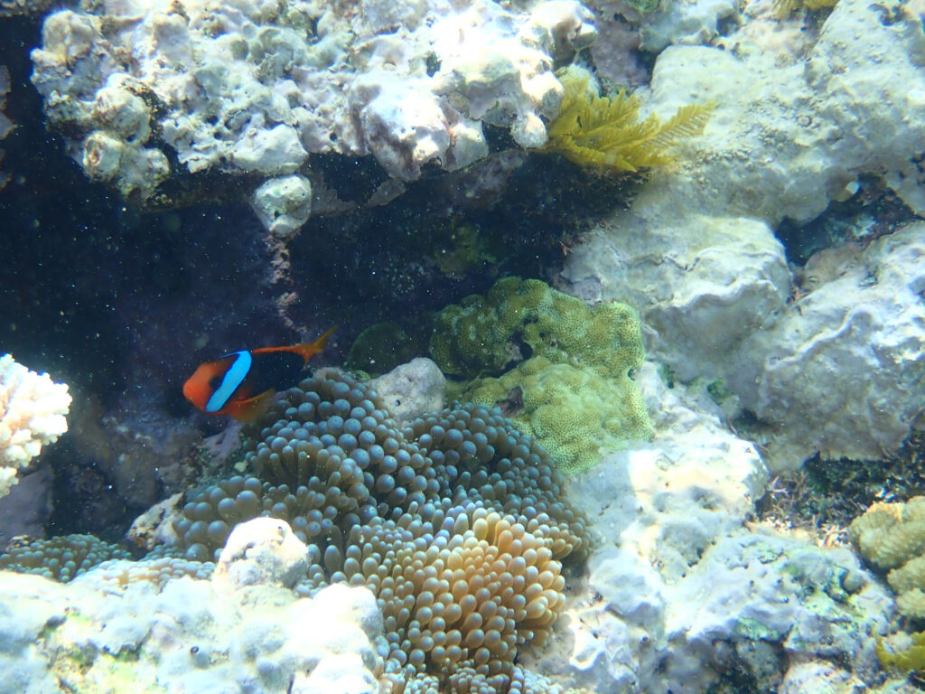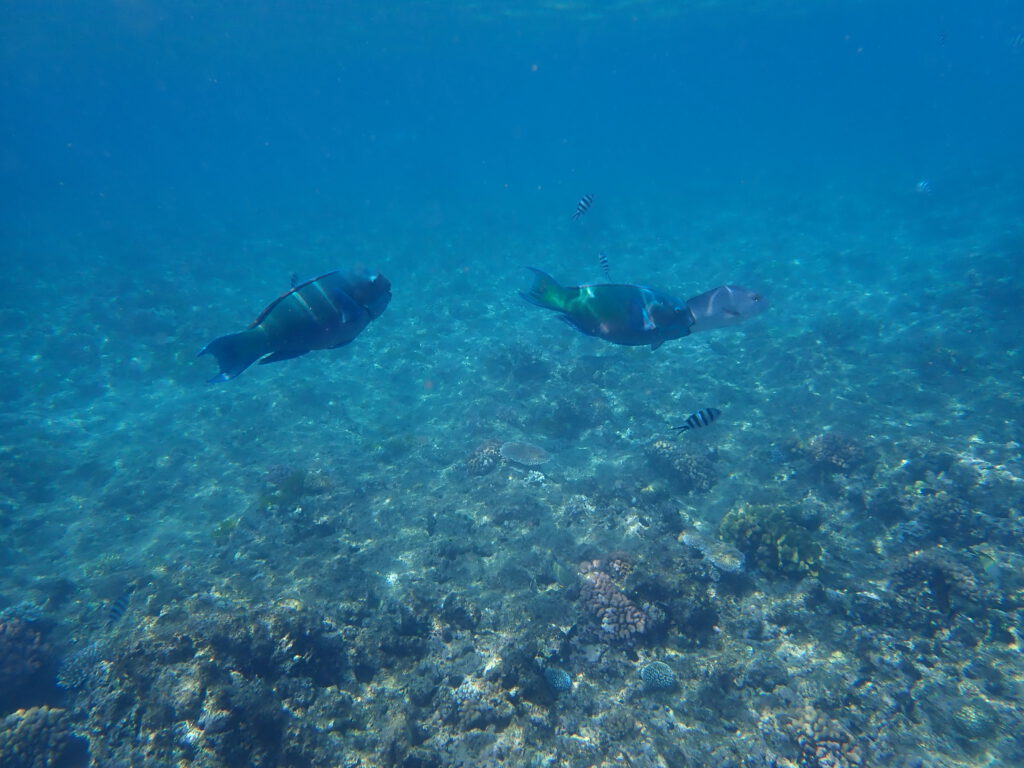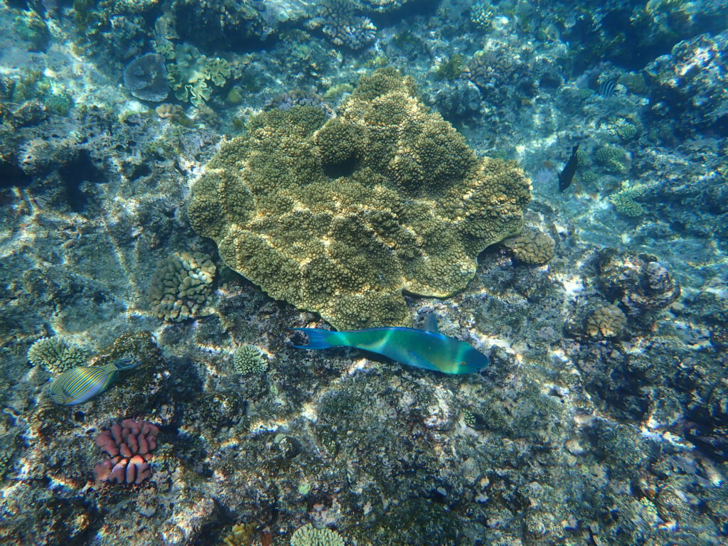 Wir haben viele verschiedene, bunte Fische und Korallen gesehen und Marc und Nadcha konnten sogar eine große Meeresschildkröte beobachten. Riesige Papageienfische zogen an uns vorbei und wir haben einige blaue Seesterne und Riesenmuscheln gesehen. Die Schnorchelgänge waren super schön, allerdings für mich auch enttäuschend. Als ich vor 14 Jahren am Riff getaucht und geschnorchelt bin, war unter Wasser alles noch viel bunter und ich erinnere mich an eine größere Artenvielfalt. Jetzt sind große Teile des Riffs bereits verblichen und an manchen Stellen wirkt das Riff wie ausgestorben. Wir haben die Auswirkungen des Klimawandels heute leider hautnah beobachten können – und Australien als einer der größter Kohle-Exporteure genehmigt weiterhin neue Kohleminen. Das war heute sehr bitter zu sehen.