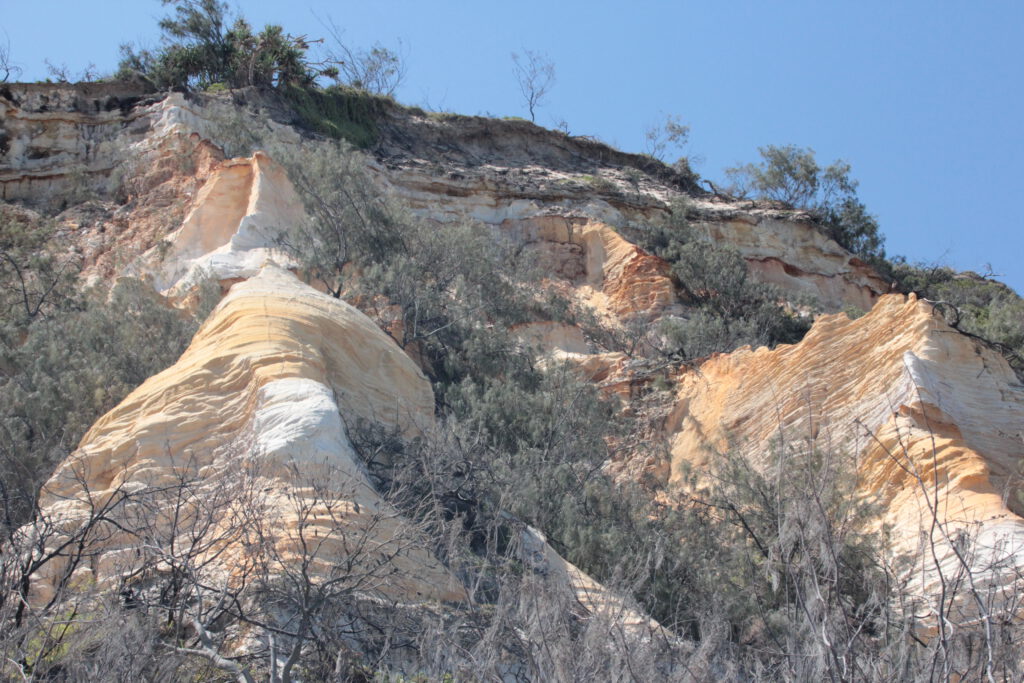 Über die Seventy-Five Mile Beach ging es dann bei Ebbe mit 80 Sachen Richtung Norden zu den Pinacles. Eine Heilige Stätte der Butchulla. Der Sandstein schimmert in den verschiedensten Farbnuancen von Weiß über Gelb bis Orange. Die Strecke soll jeden Tag anders aussehen, da die Gezeiten stark an der Insel arbeiten. Wir hatten das Glück, dass große Teile versteinerter Wald in Form von Felsformationen entlang der Beach durch einen Sturm und ein Unwetter vor wenigen Tagen freigelegt worden waren. Das sah nicht nur toll aus, sondern es machte Captain Kirk auch mächtig Spaß, die 4×4 Kiste mit Warpgeschwindigkeit dort hindurch zu manövrieren. Wir hatte übrigens so eine leise Ahnung, welches Unwetter das gewesen sein könnte…