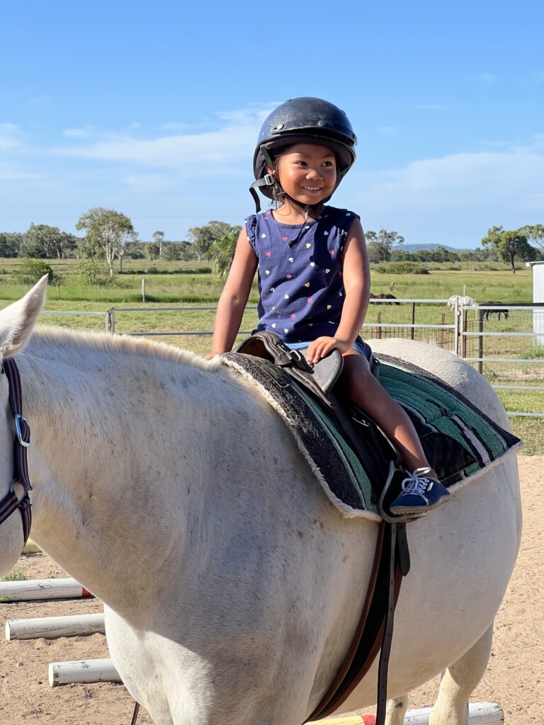 Ein großer Schimmel wartete bereits samt Ang und Mitch – den beiden Farmbetreiberinnen auf Nadcha. Der Schimmel heißt „Guest“, da er nur vorübergehend auf der Farm lebt und Nadcha sollte das erste Kind sein, dass auf ihm reiten würde. Oha! Es stellte sich jedoch heraus, dass Ang ihr Handwerk verstand, der Schimmel extrem zahm war und Nadcha einmal wieder voll im Glück. Nach 20 Minuten unter der australischen Sonne war der Spass dann auch schon wieder vorbei – sehr zum Vergnügen von Guest. Was folgte war das Programm vom gestrigen Tag… Hühner füttern und Eier einsammeln. Ponny füttern und bürsten. Ziegen füttern UND es musste erneut ein Huhn zum Krallen lackieren herhalten. Dem nicht genug, war heute selbst noch der arme zahnlose Mops dran. Was wollte er auch machen? Beissen konnte er ja nicht und das unkontrollierte Grunzen schreckte hier keinen ab. So wurden ihm pinke und grüne Krallen verpasst und anschließend mit Glitter verfeinert.