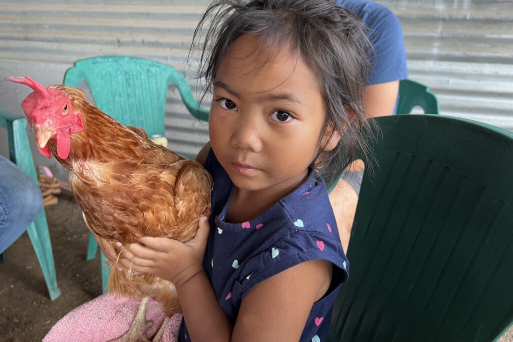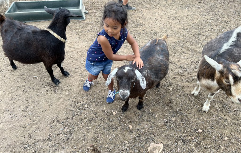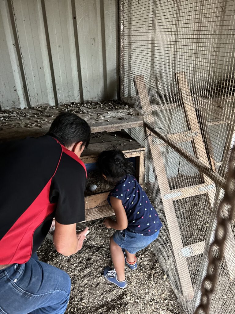 Und so durften wir um 16h mit anpacken und die Ziegen und Hühner füttern, Eier einsammeln und ein Pony striegeln. Nadcha war mal wieder im Glück. Der Höhepunkt war dann noch, dass sie einem Huhn die Krallen mit Glitzernagellack lackieren durfte. Der Hofhund passte dabei sehr gut auf, dass das Huhn nicht fliehen konnte. Nach dem Spektakel ging es für uns zu unserem Camper, um zu Abend zu essen – auch wenn sich Nadcha nur sehr widerwillig von den Tieren löste. Morgen um 16h heißt es für uns dann wieder antreten zum Dienst. Dann darf Nadcha auch auf einem Pferd reiten.