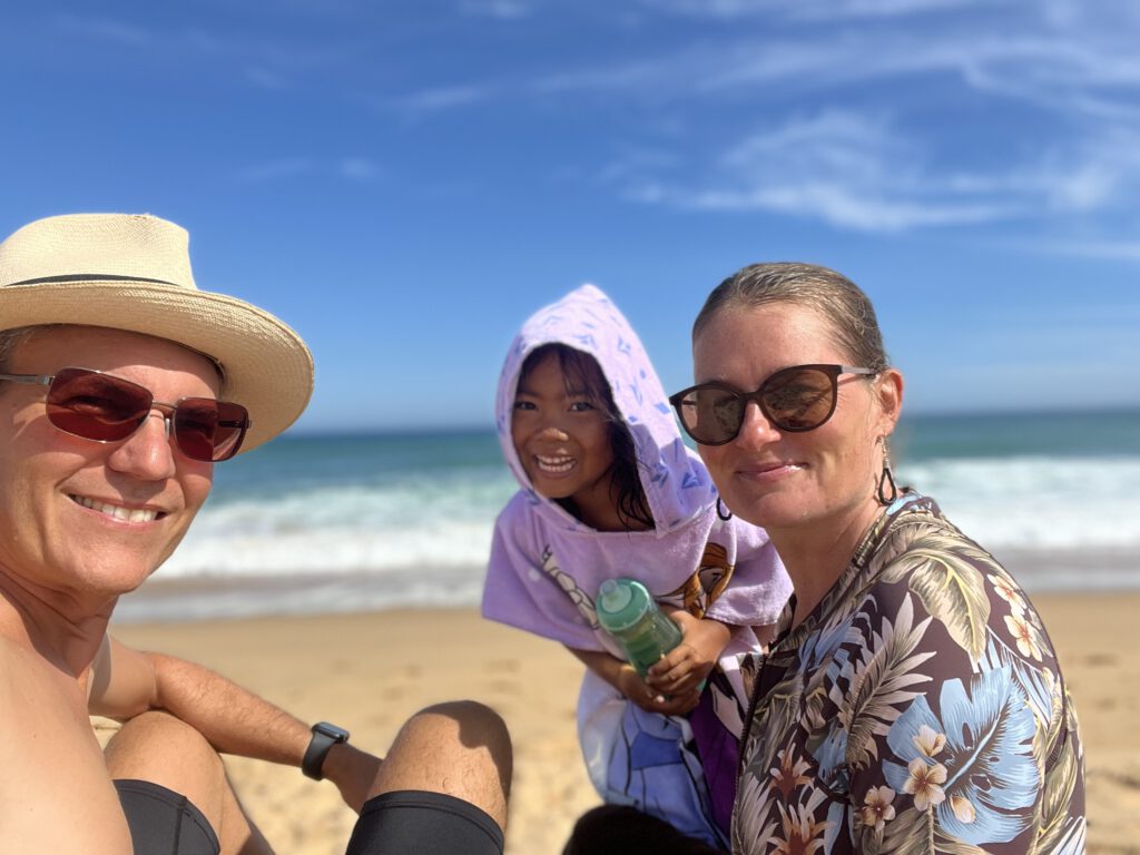 Nachdem wir auf dem kleinen und völlig überlaufenen Campingplatz unseren Camper geparkt hatten – wir haben den besten Spot am Rand ergattert, der wohl eigentlich sonst eher als Park- oder Ausweichplatz dient und stehen daher zum Glück nicht wie Sardinen eingequetscht – packten wir daher die Schwimmsachen und machten uns auf zum Strand. Die Wellen waren mega und riesig hoch, so dass Nadcha nur auf Marcs Arm eine Chance ins Wasser hatte. Es sassen 6 Rettungsschwimmerinnen gleichzeitig am kurzen patrollierten Strandabschnitt, was die Wellensituation gut widerspiegelt. Allerdings wurde zwischenzeitlich immer wieder auf den Handys getippt, was mich irgendwie etwas beunruhigte und die Aufmerksamkeit der Damen anzweifeln liess. Der zugegeben hübsche und vor allem laaaange Strand – 90 Meilen halt – schien endlos und wir fanden ein ruhiges Plätzchen zum Spielen uuund… Muscheln sammeln.