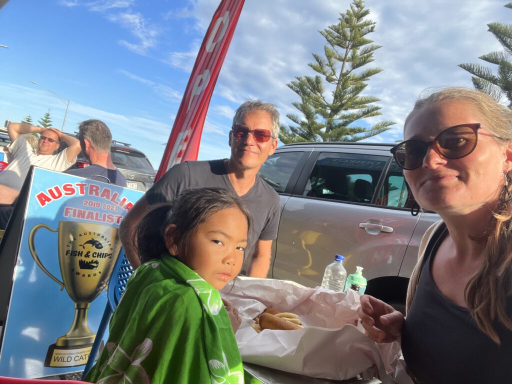 Auf dem Rückweg bestellten wir Fish & Chips in einer Bude mit eigenem Kutter und Fischern. Die Bude war wohl schon zweimal im Finale der besten Fish and Chipsläden Australiens und unsere Erwartungen waren hoch. Aber irgendwie passt auch der Laden zu dem Ort hier – wir haben schon deutlich bessere Fish and Chips gegessen.