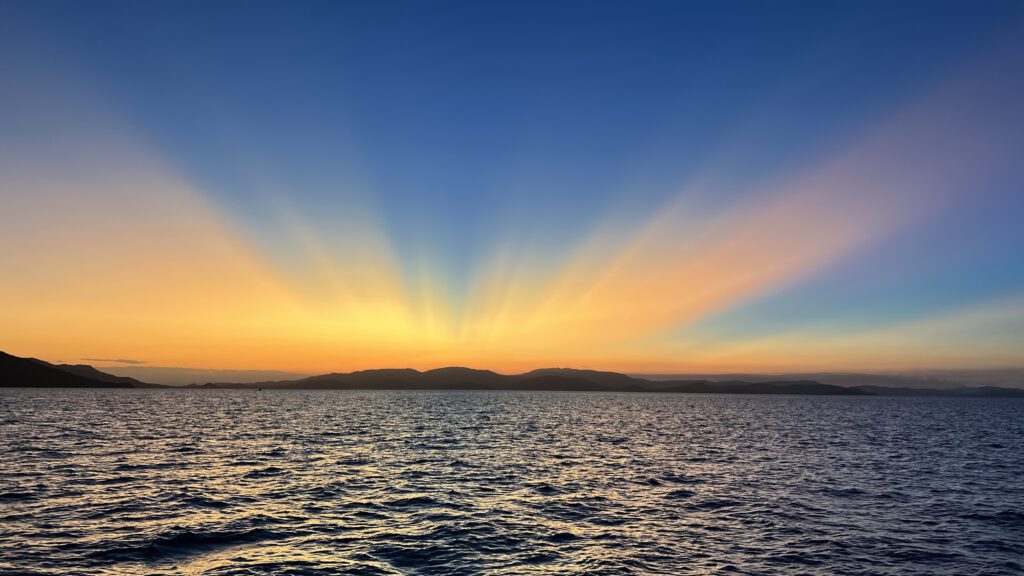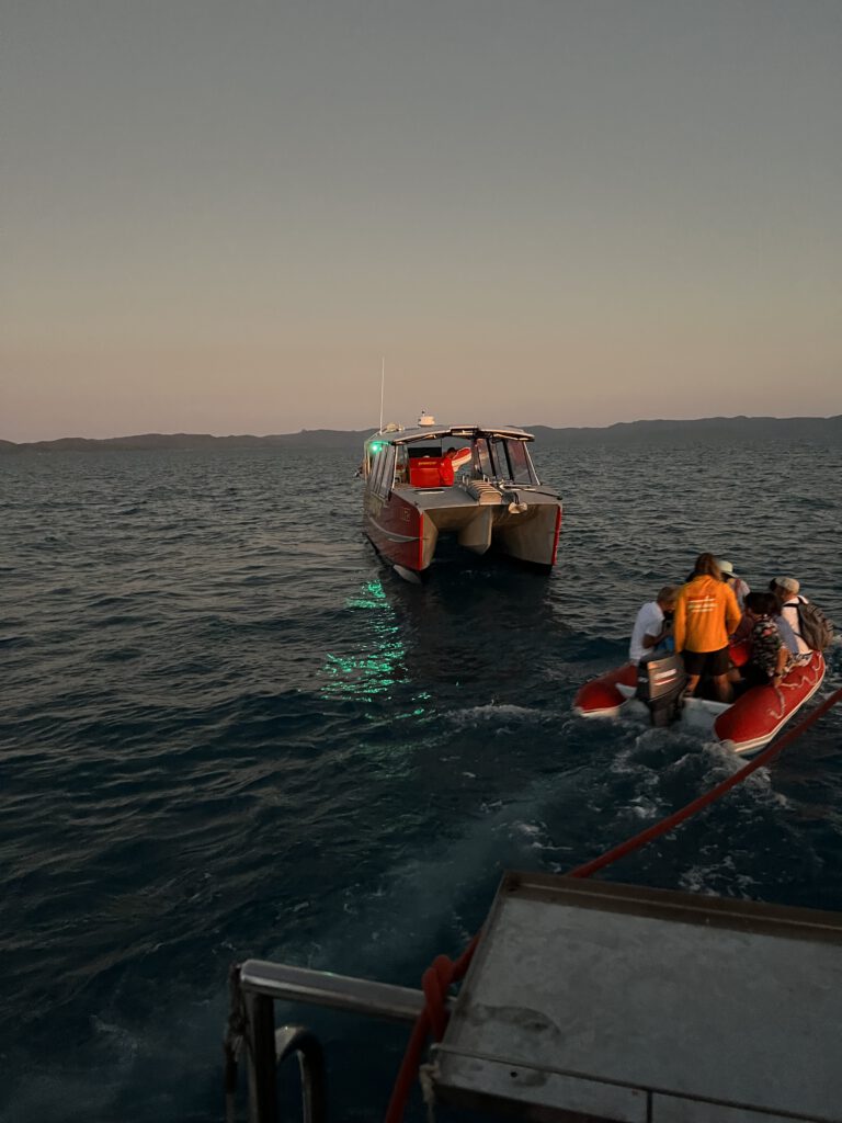Unser Weg zurück mit dem Tuckerkahn war im wahrsten Sinne sehr entschleunigend, als wir ca. in der Hälfte zum Hafen einen Motorschaden erlitten. Ein Hydraulikschlauch war defekt, der in einer langen Prozedur nur sehr notdürftig repariert werden konnte. Dennoch, der Kahn fuhr nicht mehr und so bekamen wir noch einen wunderschönen Sonnenuntergang auf dem Meer geboten – ohne das monotone Tuckern des Motors. Rettung nahte nach ca. 1h durch die Thundercat – einem Schnellboot des Anbieters – auf das wir alle umstiegen. Zu Nadchas Enttäuschung blieben der Skipper und sein Kollege auf der Tongarra zurück, aber er schenkte Nadcha noch ein Armband. Sie freute sich riesig und wollte es zum Schlafen kaum ausziehen. Eine 3/4 Stunde später als geplant liefen wir im Dunkel der Nacht in den Hafen ein. Was für ein klasse Tag.