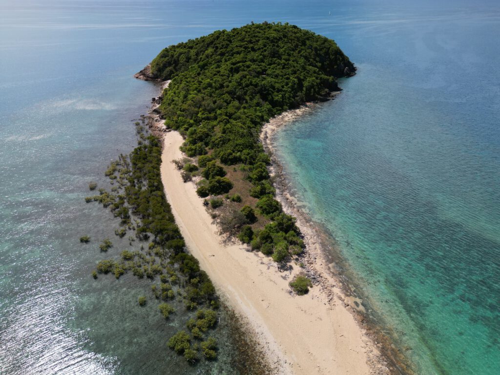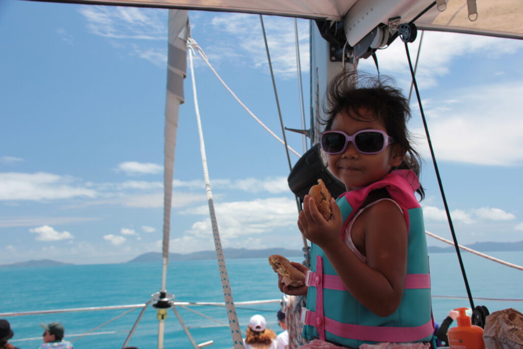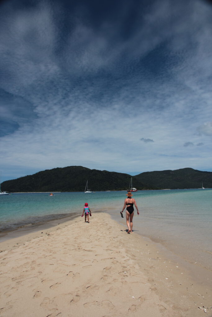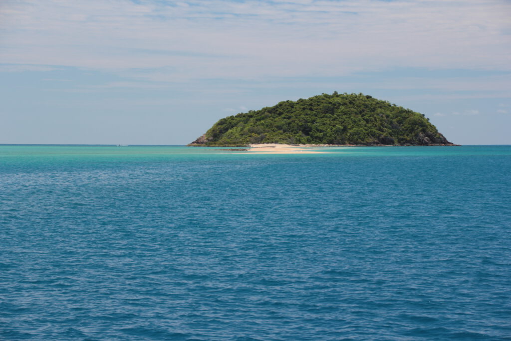 Am Meeting Point B vom Coral Sea Marina ging es für uns auf den Katamaran Tongarra von Red Cat Adventures. Zu dem Zeitpunkt wussten wir noch nicht, dass dieser Tag ein wahrhaftes Abenteurer für uns werden würde. Da der Kahn nur 5 Knoten schafft – also knappe 10km/h – war die Fahrt zu der nahegelegenen Langford Island laaaaaange. Die Insel schien garnicht näher zu kommen. Um so schöner war es, als wir nach dem Mittagessen an Bord dann auch mit einem Mal da waren. Die Langford Island ist nicht groß. Eine lange flache Strandzunge führt zu einem 30m hohen Hügel, auf dem der größte Baobapp der Whitsundays steht. Bei Ebbe ist der vorgelagerte Sandstrand mit der benachbarten One Feet Island verbunden. Diese heißt so, weil sie tatsächlich nur ein Sandhügel im Korallen Meer der Whitsundays ist, aber dennoch als eine der 74 Inseln gezählt wird.