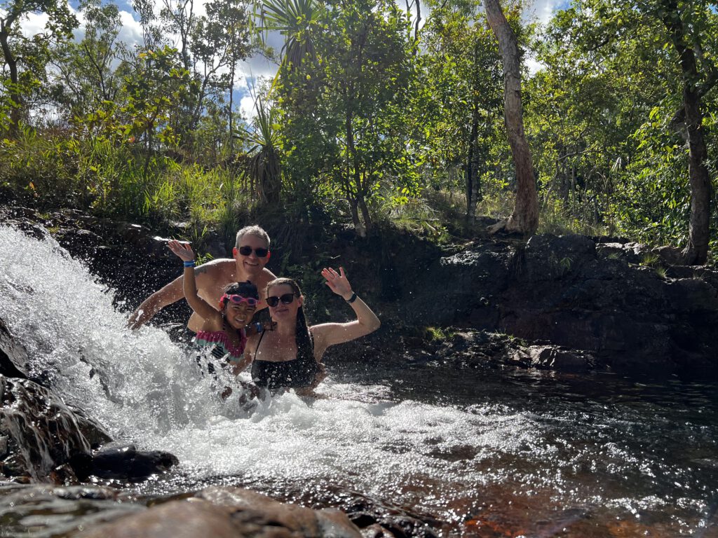 Die Wasserfälle und Pools im Park sind wunderschön und es ist nicht verwunderlich, dass Teile des Parks heilige und somit nicht betretbare Stätten der Aborigines sind. Nadcha war mal wieder nicht aus dem Wasser zu bekommen und feilschte um jede Minute. Zum Glück sind nur wenige Touris unterwegs, so dass wir zwischenzeitlich komplett alleine in den Pools von Bully Rockhole schwimmen und Nadcha ungestört tauchen und zum kleinen Wasserfall klettern konnte.