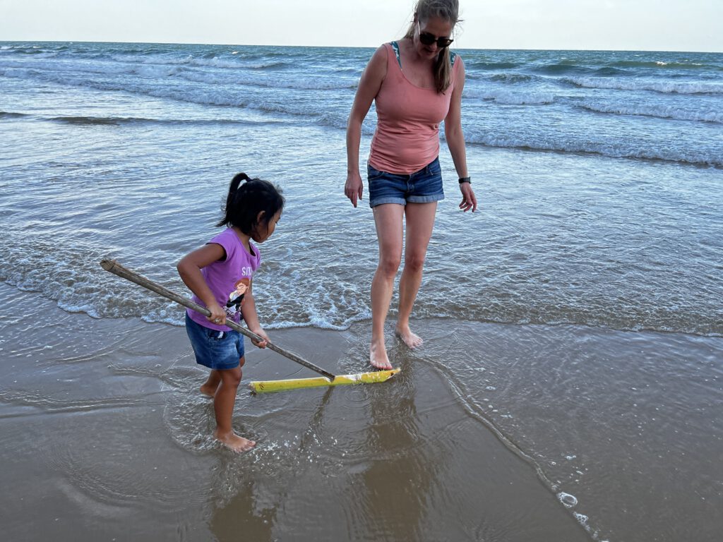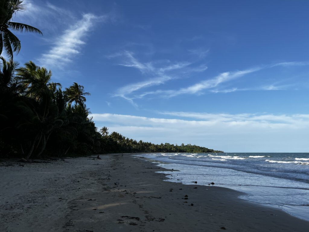 Danach ging es erneut über Innisfail und den Fischhändler unseres Vertrauens – der uns übrigens sofort wiedererkannte – auf unseren Campingplatz in Mission Beach. Leider gab es hier kein Stinger Net, sodass wir nicht ins Wasser springen wollten. Dennoch hatten wir eine tolle Zeit am Strand. Ich habe Nadcha aus einem Palmblattstiel ein Boot geschnitzt, dass man mit einem Stock durch den Sand schieben kann. Als Kind habe ich das unzählige Stunden in Nigeria am Strand gespielt – was man damals halt als Kind so machte, als es noch kein Handy gab.