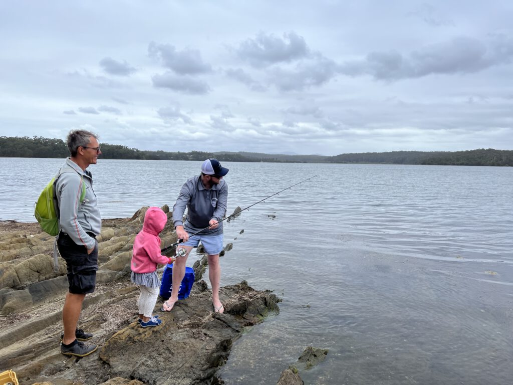 Nachdem wir geparkt hatten, erkundschafteten wir die Umgebung und spazierten am See entlang. Nadcha entdeckte und fischte riesige Schneckenhäuser aus dem See. Ein Aussie, der ursprünglich aus England kommt und deutsch spricht (sein Onkel ist Deutscher), liess Nadcha seine Angel einholen. Nadcha brauchte allerdings so lange, dass der Fisch Zeit zum Verschwinden fand. Das Wetter wurde immer ungemütlicher und so machten wir uns auf den Weg zum Camper. Es wurde gespielt, gerätselt und den Camp-Nachbarn zugeschaut. Wir beobachteten eine Familie, die über eine halbe Stunde benötigte, bis sie auf ihrem Stellplatz endlich richtig geparkt und alles austariert hatte. Das war besser als Kino, auch der Camper oberhalb des Stellplatzes machte es sich mit einem Bier in der Hängematte bequem, um das Treiben zu beobachten.