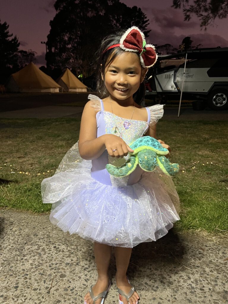 Für die Weihnachtstage hatten wir vorsorglich den Kühlschrank gut gefüllt. So gut, dass dieser es nicht mehr richtig packte und zu tropfen begann. Weihnachten am Camper und bei 30 Grad fühlte sich dieses Jahr seltsam an, war aber wunderschön. Den Camper hatten wir weihnachtlich geschmückt und Heiligabend gab es Fisch vom Grill mit Weihnachtsmütze auf dem Kopf. Nadcha war sehr aufgeregt und hatte extra Gras und Blumen für die Rentiere gesammelt – Santa und das Christkind in Verbindung zu bringen scheint für sie überhaupt kein Problem. Nachdem wir nach dem leckeren Essen eine kurze Runde auf dem Campingplatz drehten, nutze das Christkind den unbeobachteten Moment. Nadcha freute sich wahnsinnig über das lang ersehnte Elsa Tütü und eine Kuschel – Meeresschildkröte, wie wir sie auf Heron Island gesehen haben. Bis spät am Abend wurde gespielt, gesungen und getanzt.
