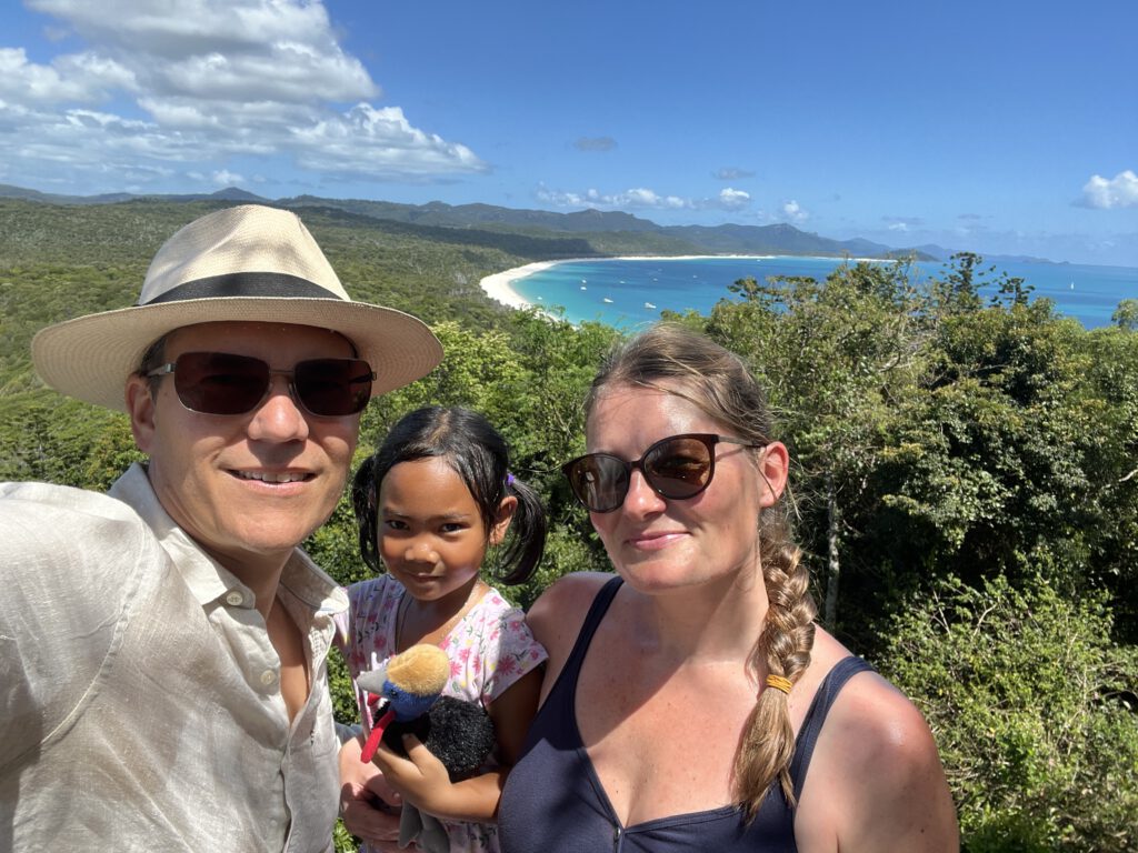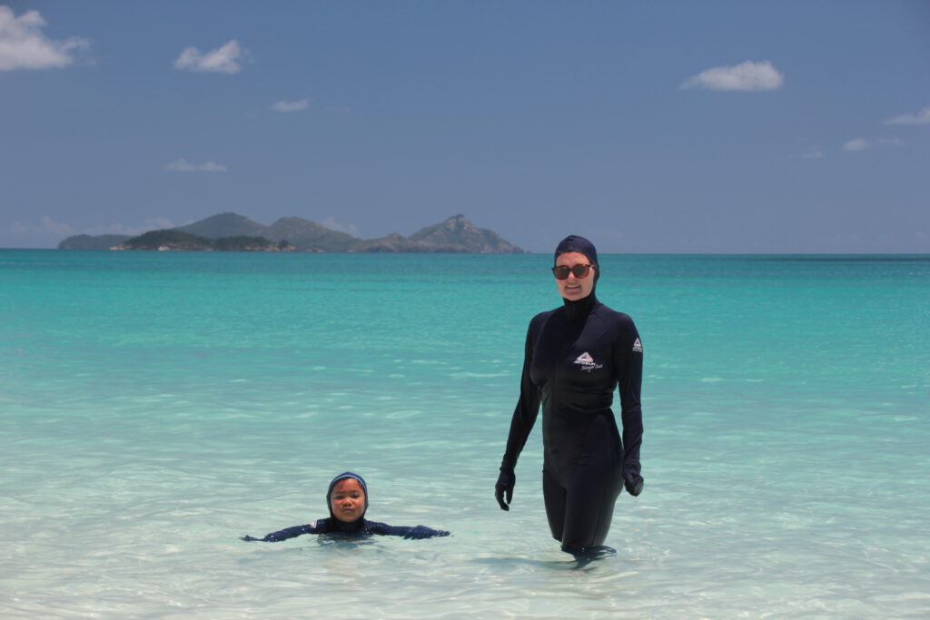 Auch wenn der Strand ziemlich „Touri“ war und verständlicherweise viele Touristen ihre Handtücher auspackten, war der zweistündige Aufenthalt dort wundervoll. Nach einem kurzen Spaziergang zu einem Lookout wurden wir mit einem tollen Blick über Whitehaven Beach und einige Inseln belohnt. Danach ging es mit Quallen-Schutzanzug ins kristallblaue Wasser samt Fischfütterung. Der Anbieter stellte außerdem Sandspielzeug zur Verfügung, so dass sich Nadcha Schaufel und Eimer schnappte und Sandbrei und -suppe kochte. Nadcha verglich den Sand mit Schnee, was bis auf die Temperatur, in der Tat ein guter Vergleich ist.
