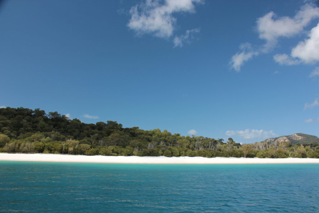 Im Bootsterminal nahmen wir einen schnellen Kaffee und Kakao ein und dann ging es endlich aufs Schiff Richtung Whitsundays. Charakteristisch für die Inseln Whitsundays sind dichter Regenwald und weiße Sandstrände. Nach einigen Stopps auf anderen Inseln, um weitere Fahrgäste aufzusammeln, ging es zum Traumstrand Whitehaven Beach. Warum der so heißt, war schon aus einiger Entfernung klar. Whitehaven ist einer der weißesten und gleichzeitig beliebtesten Strände der Welt, mit einem Quarzgehalt von nahezu 99%. Das muss wohl daran liegen, dass die Papageienfische am Riff ganze Arbeit leisten und mit ihren Ausscheidungen den Traumstrand geschaffen haben. Jedenfalls haben wir noch nie so einen weißen Sand gesehen, zudem ist der Strandabschnitt kilometerlang.