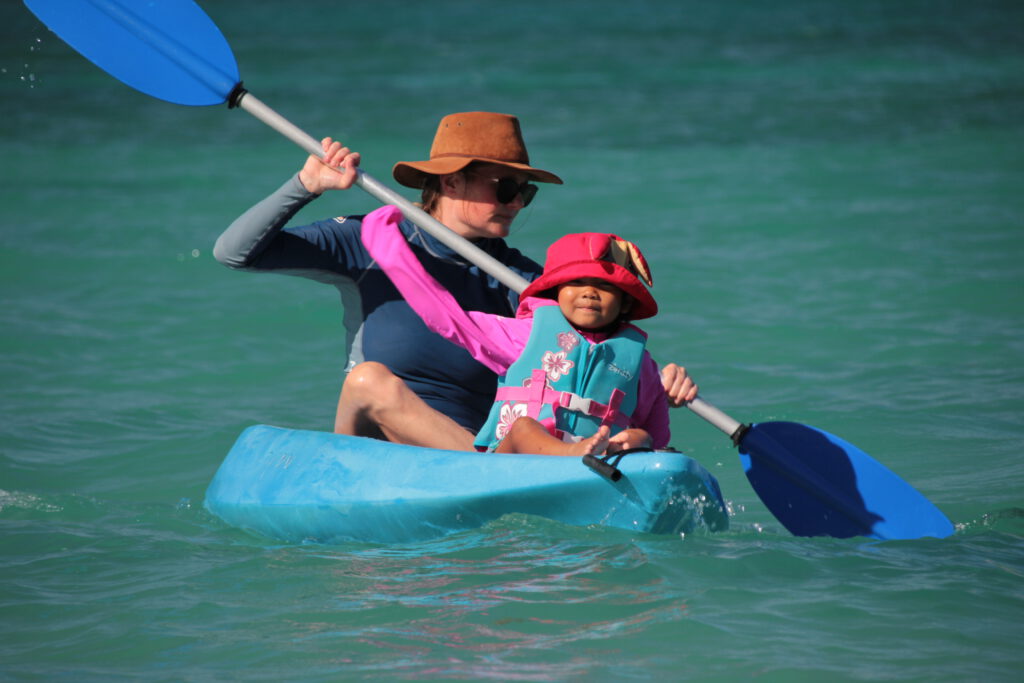 Im Anschluss fuhren wir mit dem Schiff nach Hamilton Island. Leider wurden hier einige Bausünden begangen und die wunderschöne Insel mit Hotelburgen verschandelt. Nach einer Mittagspause samt Lunch nutzen wir den kostenlosen Bus und fuhren zum Hauptstrand der Insel. Wir mieteten uns ein Kajak und Nadcha und ich paddelten entlang des Strands, an dem sich auch einige Riffabschnitte befinden. Nadcha hatte viel Spaß in den Wellen und war mal wieder nicht aus dem Wasser zu bekommen.