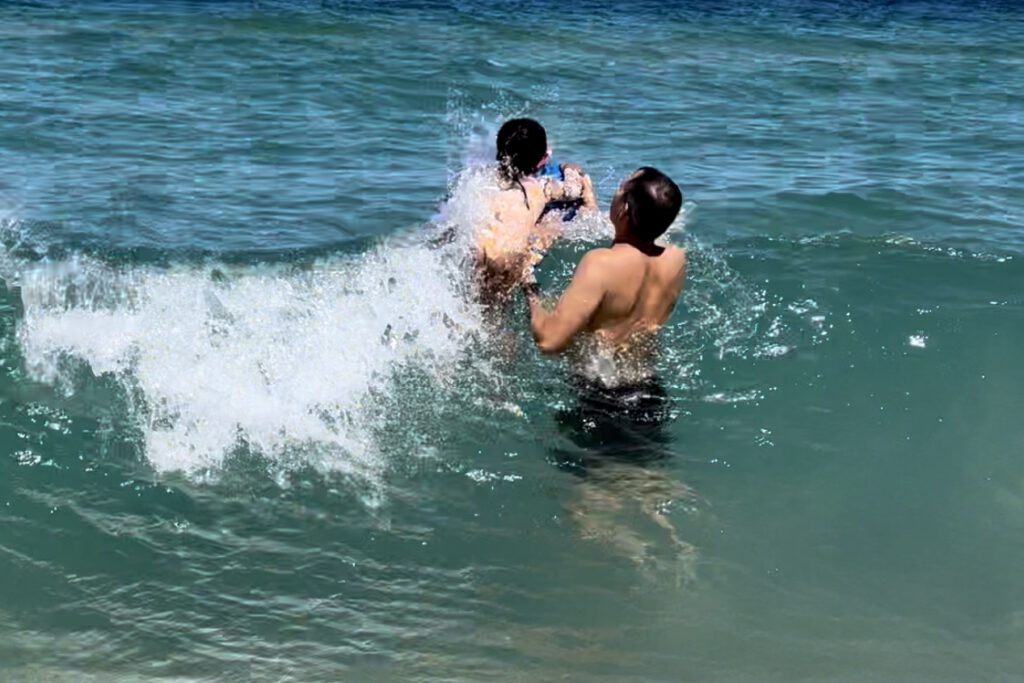 Nadcha war aufgedreht ohne Ende, da es endlich mal wieder ins Meer ging. Das Meer ist mit 20°C unverschämt kalt. Dafür sind die Wellen aber ordentlich. Das Surfen wurde allerdings umgehend aufgegeben, nachdem Nadcha von der ersten Welle aufgefressen und 3m weiter am Strand wieder ausgespuckt wurde. Danach wurde nur noch unter Wellen durch getaucht oder drüber geschwommen. Das hatte allerdings auch einen riesigen Spaßfaktor, bis das Kommando an mich gerichtet wurde: „Papa, mir ist kalt“.