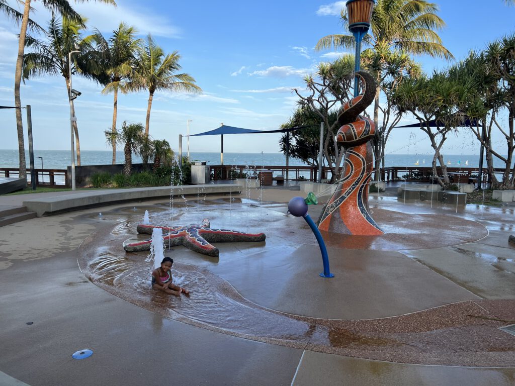 Rückwärts eingeparkt auf unserem Platz und schon waren wir auf den Weg an den Strand. Über diesen machten wir uns auf den Weg in Zentrum und zum dortigen Wasserspielplatz. Weil gerade Ebbe war, war der Strand ziemlich breit und weitläufig, so dass wir jedes Krokodil schon von weiten gesehen hätten.