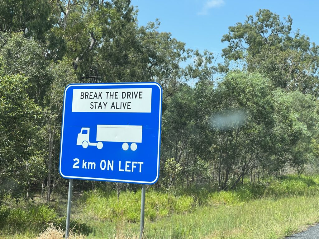 Die Fahrt war ziemlich eintönig, sowohl landschaftlich als auch die Strassenführung. Es ging geradeaus auf dem Bruce Highway. Der einzige Lenkeinschlag über 5° war kurz vor Rockhampton Richtung Yeppoon. Scheinbar haben die Australier mit diesen geraden Strassen so ihre Probleme. Alle paar Kilometer sieht man ein Schild, dass zu einer Pause animiert. „Break the drive – stay alive“, oder „Rest or R.I.P.“, oder „Stop, revive, survive“. Ja sogar mit Rätseln auf Strassenschildern wird versucht die Leute wach zu halten. „Welcher ist der höchste Berg in Queensland?“ steht auf einem Schild. 5km kommt dann die Auflösung: „Mount Bartle Frere“. Wenn dann alles nichts mehr hilf kommt eine Raststation mit kostenlosem Kaffee – sofern sie geöffnet ist. Ein klassischer Hütchenspielertrick, denn dann ist man ja bereits auf den Parkplatz gefahren.