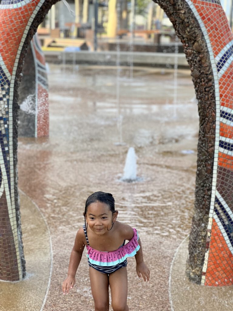 Nadcha war auf ihrem Wasserspielplatz wieder im Glück und rannte zwischen den Wasserfontänen hin und her. Sie würde wahrscheinlich noch immer dort rumlaufen, wenn wir gegen 18h nicht darauf gedrängt hätten, zum Camper zurück zu gehen, um zu Abend zu essen.
