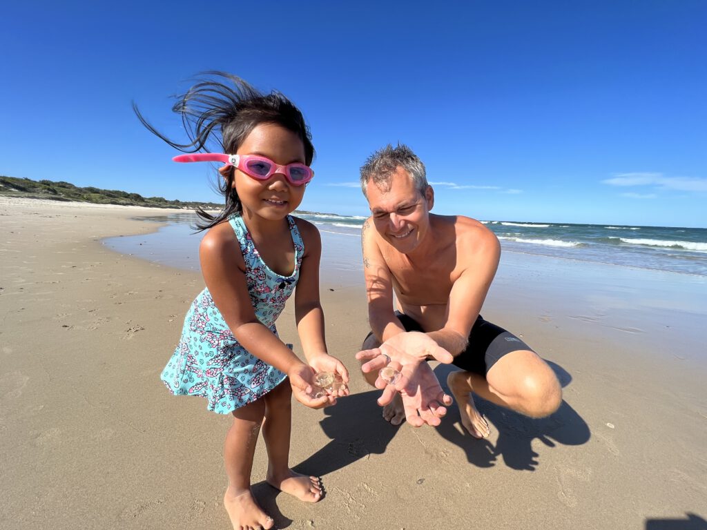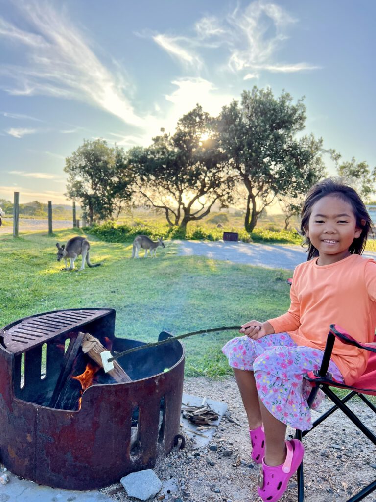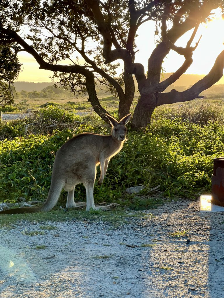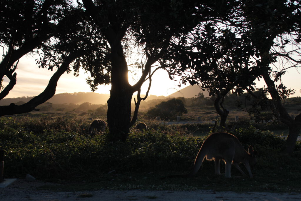 Am Strand lagen hier hunderte kleine Quallen. Nachdem wir uns bei einigen Aussies versichert hatten, dass diese nicht gefährlich sind, ging es für uns sofort ins Meer. Abends genossen wir unser Essen, dass wir über dem Feuer zubereitet hatten und beobachteten die vielen Kängurus um uns herum. Wunderschön.