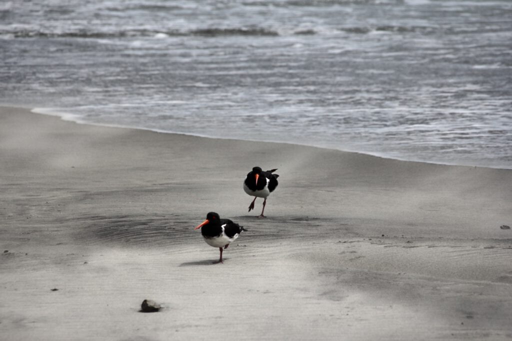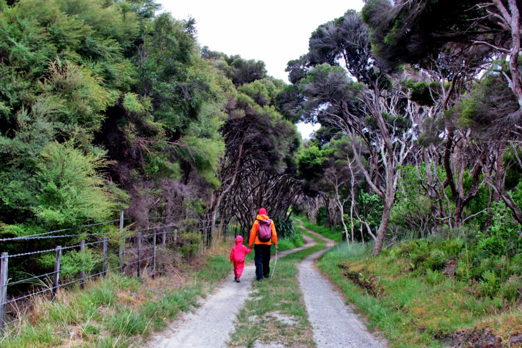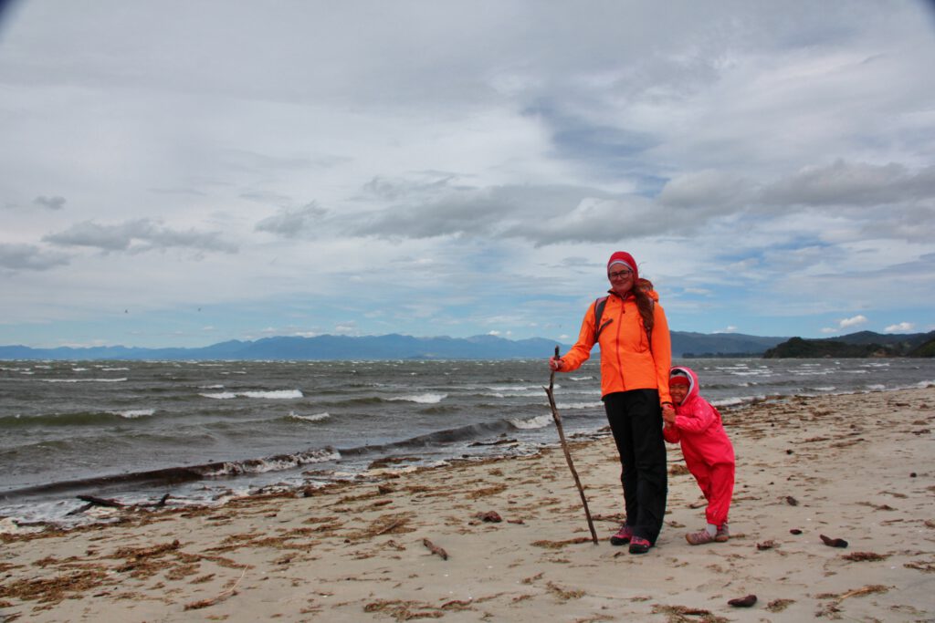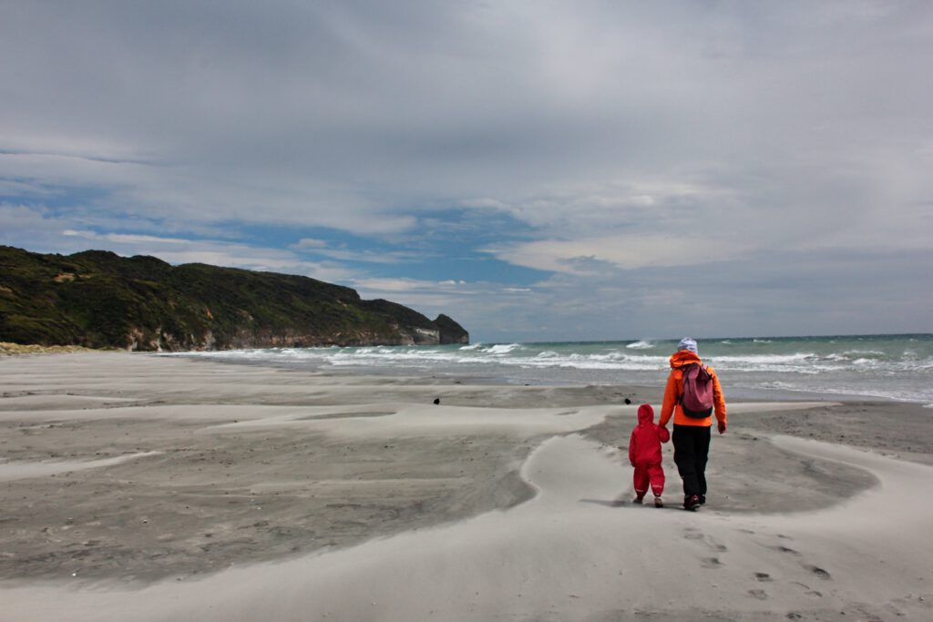 Der Wanderweg führte am inneren und äußeren Strand der Landzunge namens Farewell Spit entlang und querte diese an zwei Stellen. Was für ein Erlebnis. Wir wanderten am scheinbar unendlichen Strand entlang, an dem der Wind nur so peitschte und regelrechte Sandkunstwerke hinterliess. Es schien als würde der Strand in der Ferne vom Meer verschluckt und die wehenden Sandboen, die die Sicht vernebelten, liessen das Ganze irgendwie unwirklich erscheinen. Teilweise musste Marc Nadcha auf die Schulter nehmen, damit die kleine Maus keinen Sand ins Gesicht geweht bekam. Wir waren heute so froh über unsere Mützen und windfeste Kleidung, die sich in dem starken Wind aufblähte und Nadcha sehr amüsierte. Kein Mensch war zu sehen auf unserer Runde, dafür schwarze Schwäne, zahlreiche Austernfischer, jede Menge Sand und das Meer. Wir liefen den Strand bis zu einer sich auftürmenden steilen Felsküste entlang, vor der wir die Landzunge durch einen mystischen Wald, Dünen und Wiesen mit hunderten Schafen querten. Diese Wanderung war so vielseitig und besonders, dass wir dieser 5 von 5 Sternen geben würden.