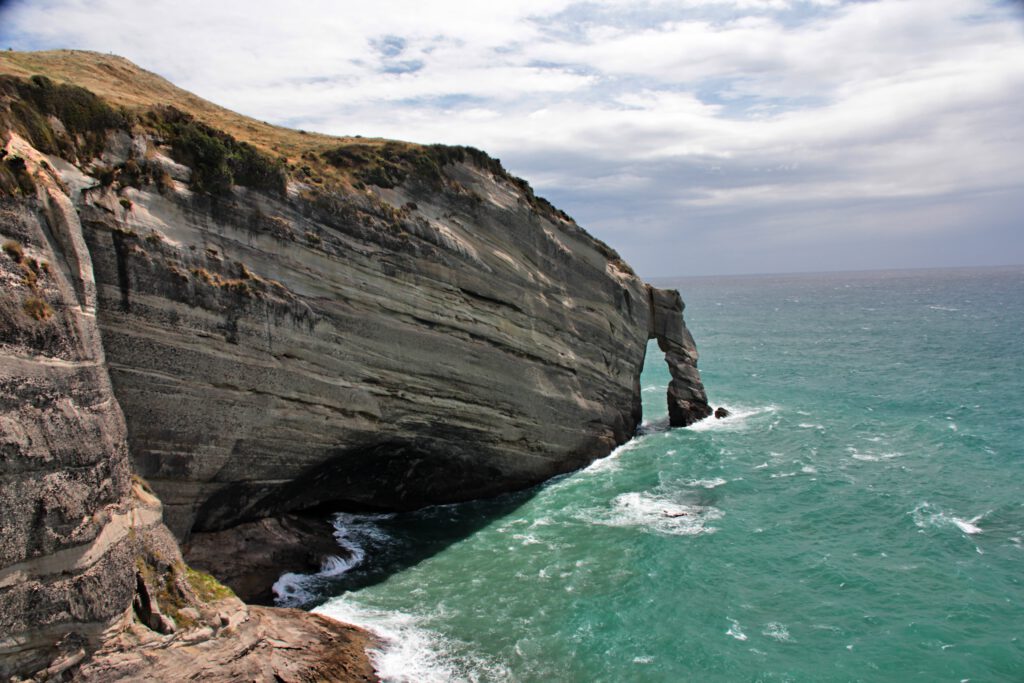 Den nördlichsten Punkt hatten wir zwar noch nicht gesehen, aber dorthin fuhren wir im Anschluss – natürlich wieder auf Schotterpiste. Ein kurzer Spaziergang führte uns zu Cape Farewell, einer Felsformation an der Steilküste mit einem ausgewaschenem Torbogen im Wasser. Ein Schild mitten auf dem Aussichtsplatz bestätigte uns nochmals, dass wir nun den nördlichsten Punkt der Südinsel erreicht hatten. Von hier aus fuhren wir im Anschluss ein Stück südlich zu einem Freedom Campingplatz direkt am Meer.