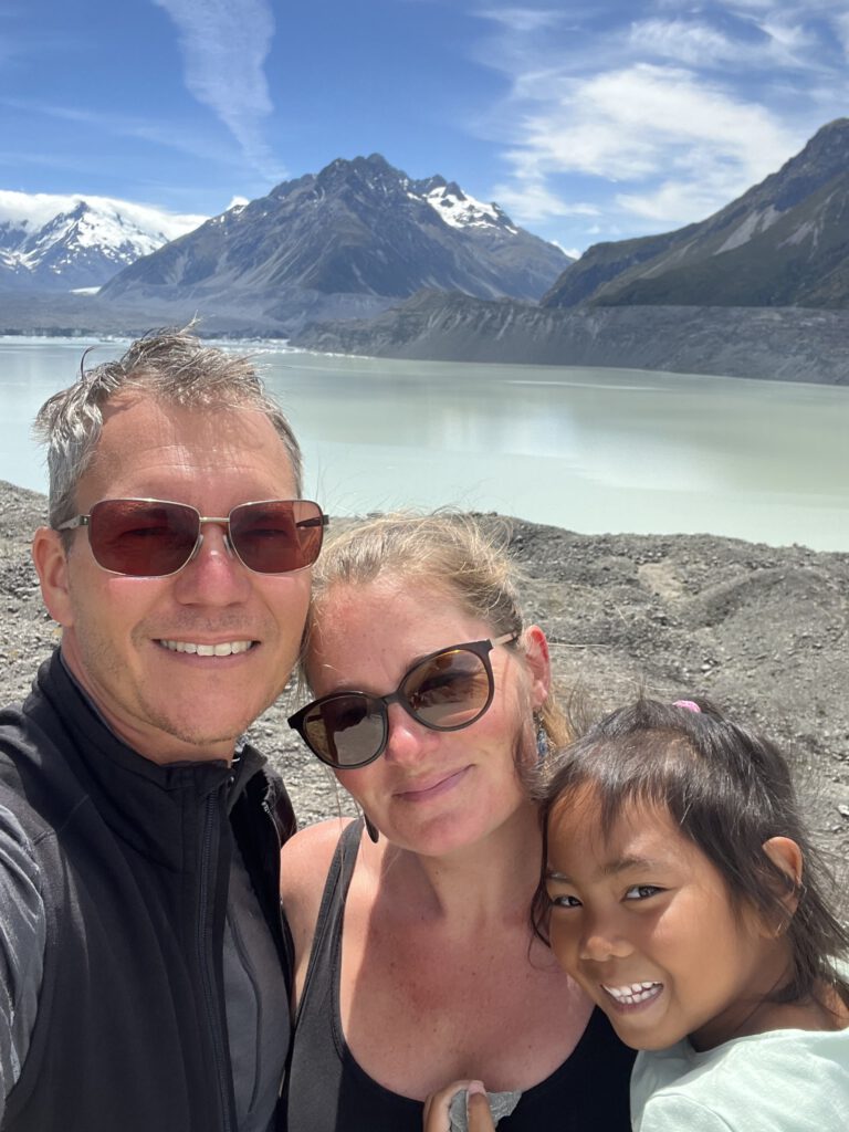 Da wir gestern bereits einen Blick auf Lake Hooker werfen konnten, wollten wir heute in das Nachbartal fahren, um Lake Tasman zu bewundern. Die 300 Stufen des kurzen Wanderweges waren ein Kinderspiel für Nadcha und schnell waren wir am Aussichtspunkt. Lake Tasman ist mit 12km Länge der größte Gletschersee Neuseelands. Ein Schild verriet uns: Der Gletscher selbst – ebenfalls der größte seiner Art – hatte 2011 noch eine Länge von 24km und eine Fläche von 92km2 – zieht sich aber mit 480 bis 820m pro Jahr zurück, sodass er bereits 2027 nur noch eine Länge von 20km haben soll. Vor 14.500 Jahren sah es hier in der Gegend noch ganz anders aus. Zu dieser Zeit – so schätzt man – hatte der Gletscher noch eine Länge von 85km und reichte bis an ein kleines Örtchen Namens Twizel heran, durch dass wir bereits von der Hinfahrt in das Gebirge gefahren waren. Auch lag zu dieser Zeit unser Aussichtspunkt – an dem uns heute die Sone auf dem Kopf brannte – 1.500m unter Eis begraben.