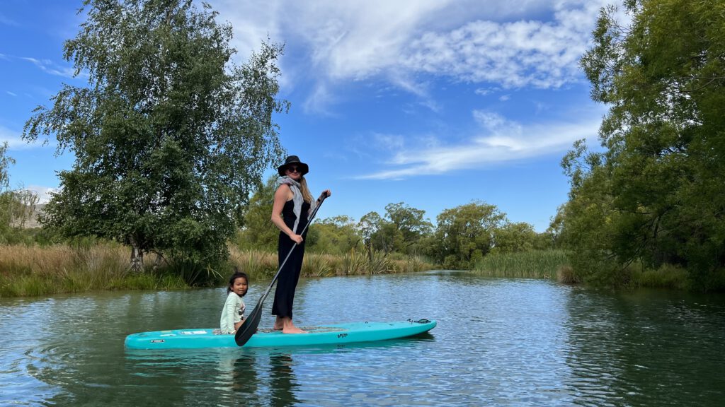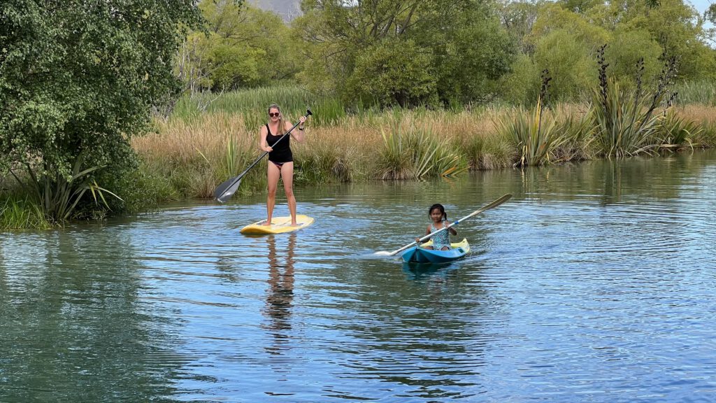 Der Campingplatz bot alles, was wir uns erträumten: Eine heiße Dusche. Vorher gingen wir aber noch runter an den Fluss. Hier konnten wir uns aus dem Holzschuppen ein Kayak und ein SUP kostenlos leihen und noch etwas herum paddeln. Nach einer Runde wollte Nadcha unbedingt einmal alleine in ein Kayak. Da der kleine Fluss absolut zahm war, machten wir uns also zu dritt auf zu einer weitere Runde. Nadcha hatte das Navigieren nach kurzer Zeit bereits super heraus. Auf der Zielgeraden machte es dann aber doch noch „platsch“ und wir zogen unser nasses und lachendes Kind zu Nanette auf das SUP. Jetzt war es dann wirklich Zeit für eine heiße Dusche…
