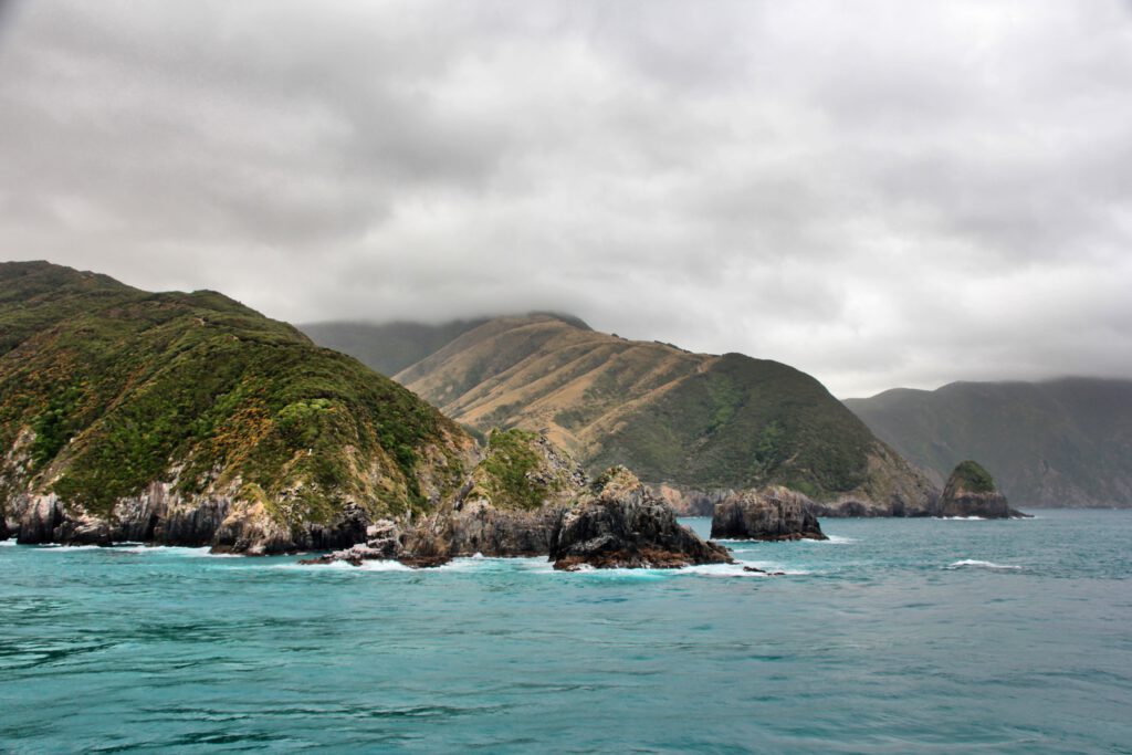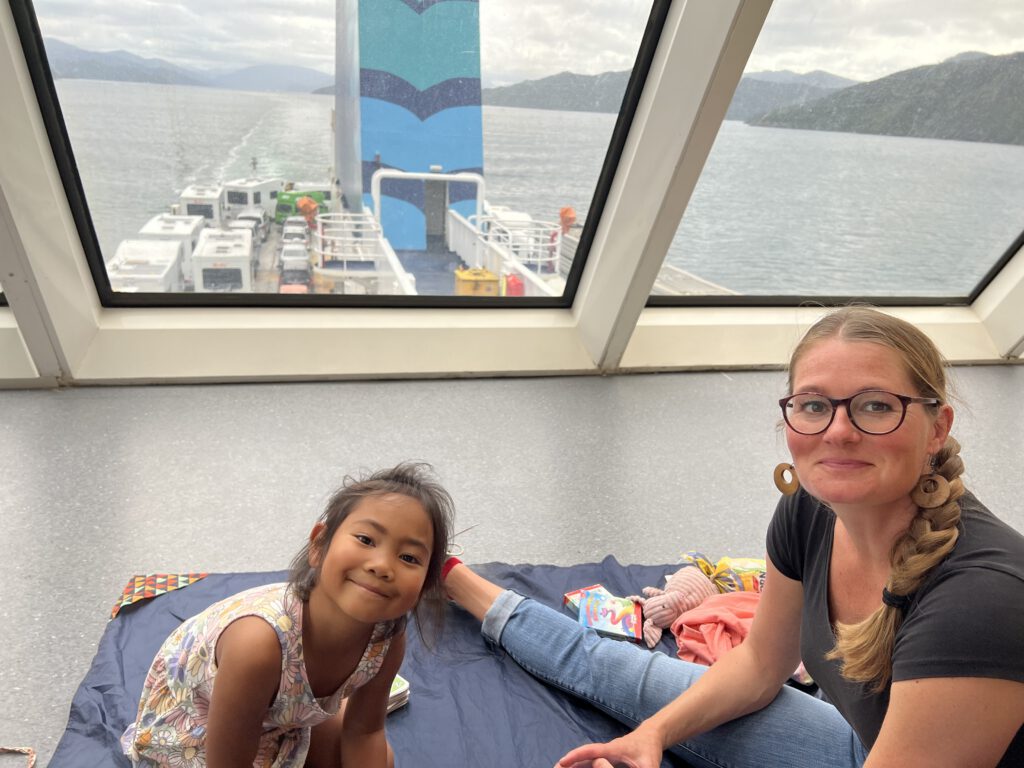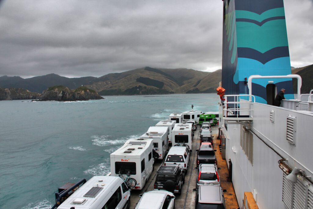 Wir machten uns also am Morgen zeitig auf den Weg nach Picton, da eine kurvenreiche Strecke entlang der Sounds vor uns lag. Die Strecke meisterten wir drei ohne größere Probleme, sodass wir in Picton noch etwas Zeit zum Bummeln und Essen hatten. Im Anschluss ging es drei Strassen weiter zum Fährhafen und dort weiter zum Vehicle Check-in. Hier wurden wir in unsere Spur eingewiesen und warteten mit den unzähligen anderen LKW, Campern, Autos und Motorrädern darauf, dass es losging. Als sich die Schlange endlich in Bewegung setzte, fuhren wir zügig in den stählernen Bauch der Fähre. Wir wurden auf dem offenen Deck ganz am Rand des Schiffes auf unseren Stellplatz eingewiesen und verließen unseren Camper in Richtung Aufenthaltsräume.