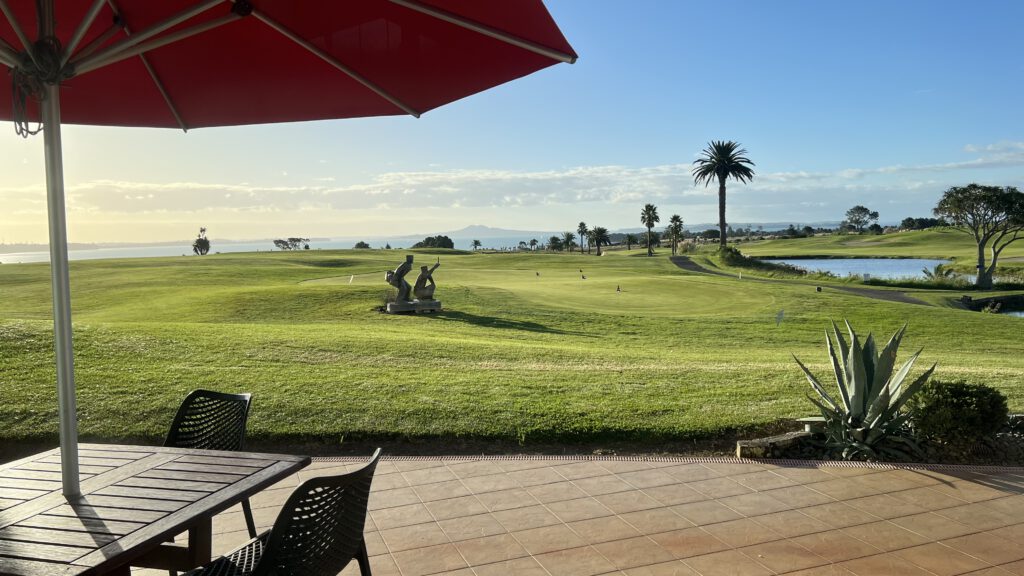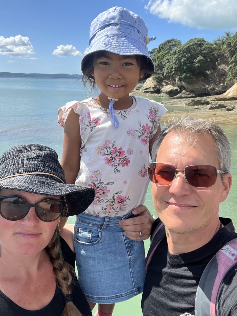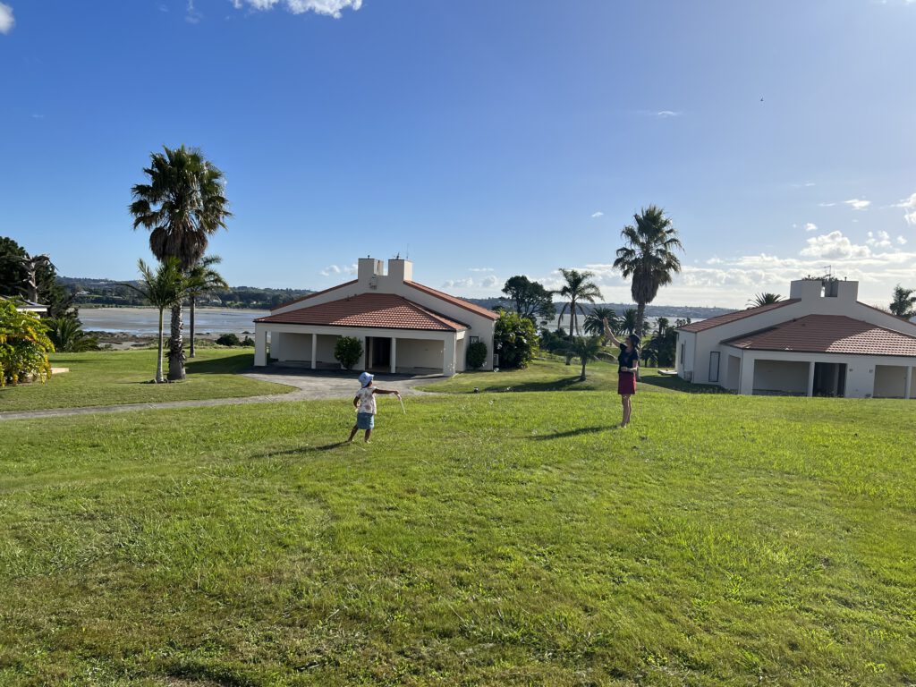 Im Golf Resort gibt es nicht wirklich viel zu tun für unsere Maus. Nach einem enttäuschenden Frühstück spazierten wir daher über das Resort bis nach Beachlands. Dieser äußere Vorort von Auckland liegt an der Küste und wir starteten unsere Erkundung mit dem Test der hiesigen Spielplätze. Einer der Plätze lag direkt am Meer und bei diesem Ausblick spielte die ganze Familie Erkelenz Piraten: Es wurde Anker gelichtet, Segel gesetzt und Haiangriffe abgewehrt.