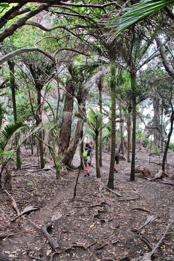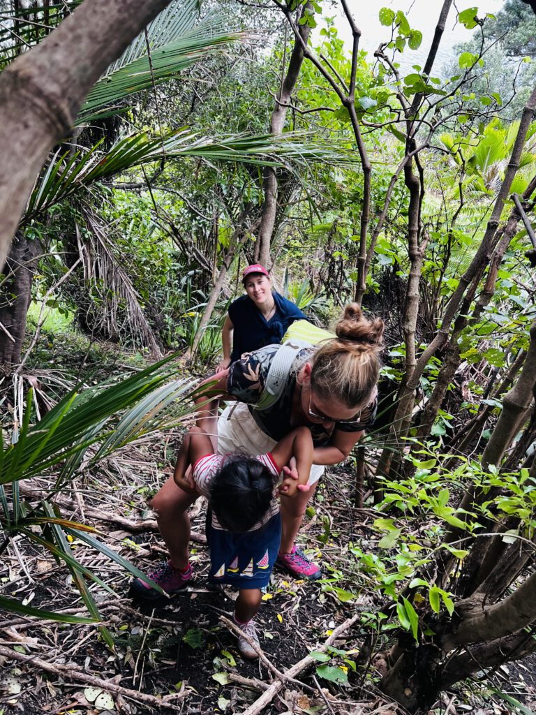 Nach einer Stunde hatten wir jedoch keine Lust mehr zu warten, zogen uns die Schwimmsachen drunter und los ging’s. Wir liefen am Strand entlang bis zu einem Wasserarm, der bis zur Hüfte reichte. Das war also der Grund für die „Ebbe-Empfehlung“. Wir packten die Kinder kurzerhand auf die Schultern und wateten durch das Wasser. Dann ging es auf Steinen 500m entlang der Küste und die Kinder hielten gefühlt an jeder Fels- und Steinspalte, um Muscheln und Krebse zu suchen. In dem Tempo hätten wir den Strand auf der anderen Seite des Hügels wohl nie erreicht. Also wurden die Kinder wieder auf den Schultern der Väter bis zum Einstieg des Wanderwegs transportiert. Der Weg war abenteuerlich und vermutlich waren wir auch nicht ganz richtig, denn es ging durch dichten Dschungel nach oben – die Kinder hatten großen Piraten- und Entdeckerspass. Endlich zeigte sich ein vernünftiger Weg, der hoch zum Hügel führte. Oben angekommen, hatten wir einen traumhaften Blick auf den menschenleeren New Chums Beach. Dort wurde gepicknickt und Marc und ich stürzten uns außerdem mutig in die Wellen. Der Strand war wirklich ein Traum und aufgrund unserer Ungeduld auch völlig leer gefegt. Erst als wir wieder aufbrachen, kamen uns zahlreiche Tourist entgegen, die wohl die Ebbe Empfehlung eingehalten hatten.