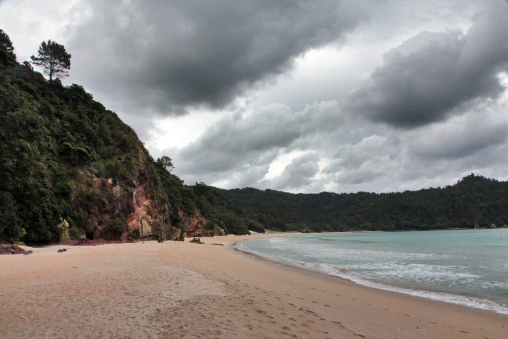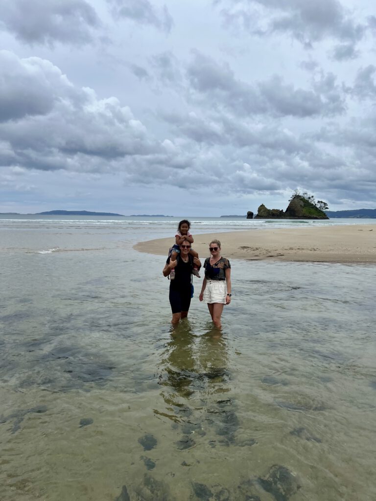 Wir fuhren eine wunderschöne Küstenstrecke, entlang vieler Buchten und kleiner Örtchen, Richtung Norden. Auf Empfehlung von Flo, den wir in Tongariro getroffen hatten, wollten wir in Whangapoua Halt machen, um von dort einen kleinen Wanderweg über einen Hügel zum New Chums Beach zu absolvieren – einem der schönsten Strände Neuseelands, der nur per pedes erreichbar ist. Bereits nach einer Stunde fuhren wir also in Whangapoua ein und wer war saß bereits auf der Picknickbank neben dem Spielplatz? Mats samt Familie. Die Kinder freuten sich riesig und spielten sofort auf dem großen Spielplatz. Auch Carsten und Vanessa hatten geplant, die kurze Wanderung zur New Chums Beach zu machen und schnell war beschlossen, dass wir gemeinsam losziehen. Allerdings mussten wir uns noch etwas gedulden, da wir gerade Höchststand der Flut hatten und die Wanderung nur zwei Stunden vor und nach Ebbe empfohlen wird.