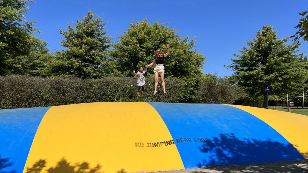 Eine neue Erfahrung war auch die Rezeption auf unserem Campingplatz in Christchurch. Wie bei Mäcces kann man hier mit dem Camper ganz entspannt through driven und den Stellplatz aus dem Fenster buchen und bezahlen. Sehr praktisch. Es war schon fast 16 Uhr und wir hatten keine Lust auf „Schnell Schnell“ und eine Busfahrt in die Stadt und blieben daher einfach hier – auf dem Hüpfkissen, im beheizten Pool und kochend in der Camp Kitchen. Denn das ist auch neu – wir haben keinen BBQ mehr am Auto – sehr zum Unmut von Marc.