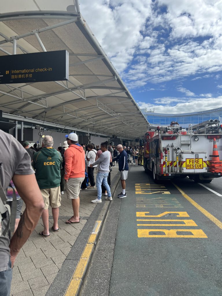 Auch nach dem Mittagessen nutzen wir die Zeit noch für etwas Neues und übten das Einlochen auf einem Übungsplatz, bis es Zeit war unser Gepäck abzuholen. Das Taxi wartete pünktlich um 15:30 Uhr auf uns und erneut ging´s los zum Flughafen. Aber was war das schon wieder? Vor dem Flughafen stand eine riesige Menschenmenge und außerdem zwei Feuerwehrwagen. Auch in ihren Masken schwer atmende Feuerwehrleute waren zu sehen und kurz blieb uns der Atem weg. Sollte der Flug heute erneut nicht stattfinden können? Nach einigen Minuten der Spannung stelle sich das Ganze glücklicherweise als Fehlalarm heraus und das Chaos löste sich auf. Das Einchecken und Boarden konnte fast pünktlich beginnen und auch der Flug verlief reibungslos. Um 0:30 Uhr landeten wir schließlich auf Tahiti und eine warme Luft schlug uns entgegen.