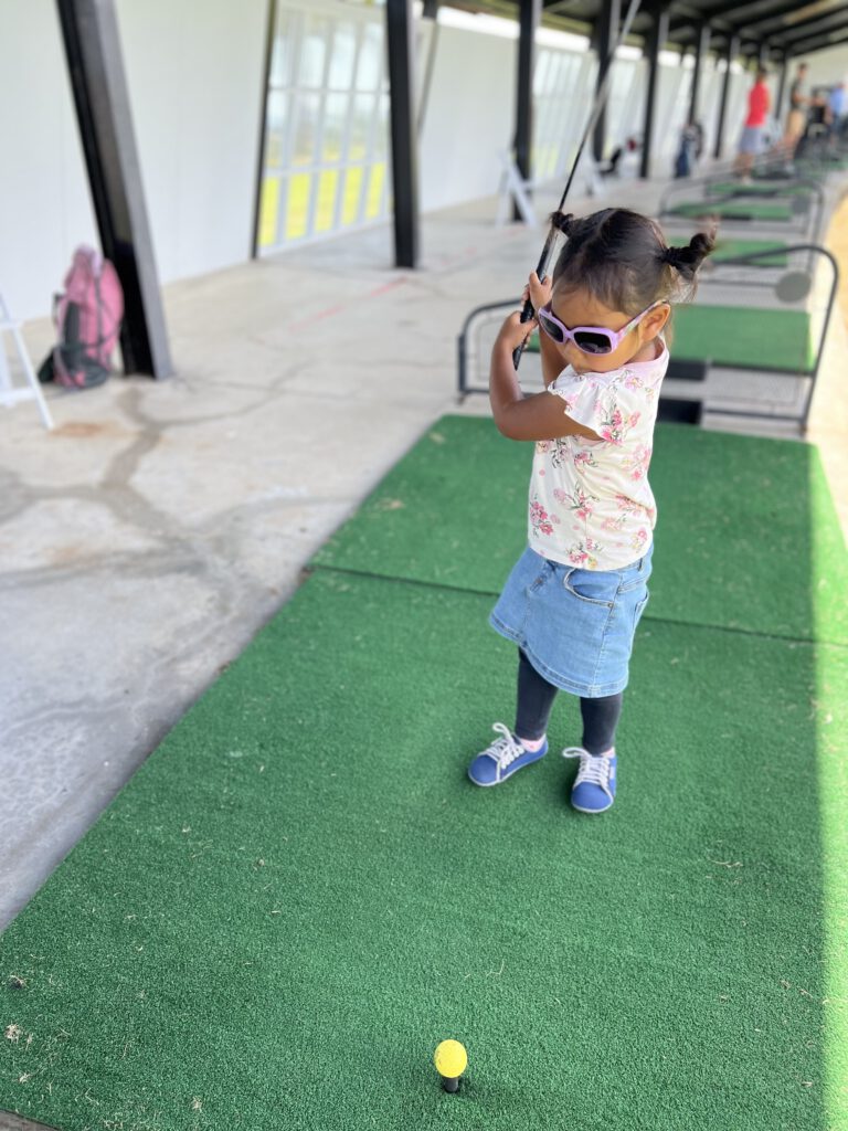 Wenn wir schon in einem Golf Resort untergebracht sind, sollten wir das auch nutzen. Also packten wir nach dem Frühstück unsere Taschen und lagerten diese an der Rezeption zwischen. Dann liehen wir uns 3 Golfschläger aus und ab ging´s zur Driving Range – dies ist eine Anlage, in dem Golfer ihren Golfschwung üben können. Marc hat über die Arbeit zwar mal an einem Teammeeting auf einem Golfplatz teilgenommen, aber so wirklich Ahnung vom Golf hat von uns niemand. Wir beobachteten also die anderen Übenden in ihren weißen Schühchen und taten es ihnen nach. Anfangs etwas holprig, hatten wir nach einigen Versuchen alle Erfolgsmomente zu verzeichnen und besonders Nadcha ließ sich nur durch die Aussicht auf ein Mittagessen von der Trainingsbahn bewegen. Zwischendurch überlegte sie, ob sie wirklich noch unbedingt reiten will oder ob Golf ihr neuer Sport ist ;-). Bitte nicht!!!