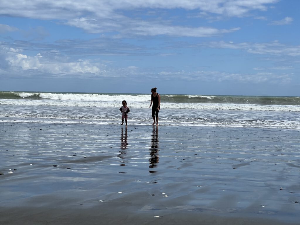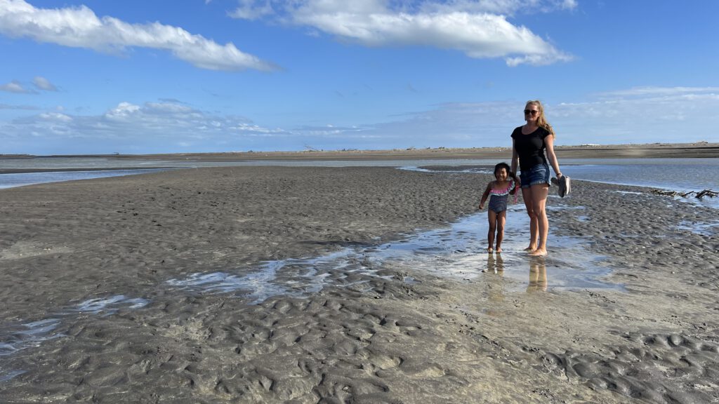 In dem hiesigen Informationszentrum wurden wir fündig und deckten uns mit zahlreichen Heftchen und Broschüren ein. Nadcha spielte währenddessen in der Playmobilecke und selbstverständlich war es nicht einfach, sie aus dieser wieder hervorzulocken. Schließlich erreichten wir unseren Campingplatz in Koitiata gegen 16 Uhr und machten uns auch sofort auf Richtung Strand. In Badeanzügen und -hose wollten wir eigentlich sofort ins Wasser springen. Allerdings erwartete uns ein etwas „anderer“ Strand. Zwischen Meer und Campingplatz verlief ein Wasserarm, der aufgrund der schwindenden Flut noch gut gefüllt war. Eigentlich ist das ja kein Problem, denn man kann in diesen Wasserarmen entweder schwimmen oder durch diese hindurchwaten. Allerdings war das Wasser hier nicht wirklich tief und der Untergrund weich und lehmig. Beim Versuch den Wasserarm zu überqueren, sanken wir teilweise bis zu den Knien im Matsch ein. Das war zwar lustig, aber die Operation schwimmen mussten wir für heute für gescheitert erklären.