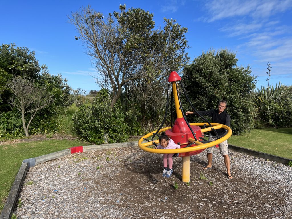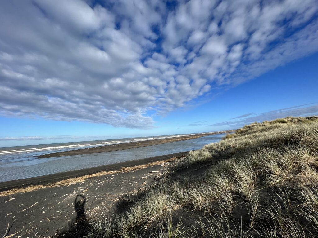 Unseren Campingplatz verliessen wir heute Morgen für unsere Verhältnisse recht zügig. Nadcha nutzte das riesige Hüpfkissen solange wir den Camper startklar und frisch machten. Dann ging’s los zum Großeinkauf in einem Stadtteil Wellingtons. Auf eine Stadtbesichtigung der neuseeländischen Hauptstadt hatten wir keine Lust und so fuhren wir direkt Richtung Norden und raus aus der Stadt. Nach ca. einer Stunde Fahrt machten wir am Otaki Beach eine Pause. Wir packten unser Mittagessen aus, liefen vor den Wellen weg und sammelten natürlich mal wieder Muscheln. Wir verbrachten eine schöne Zeit an dem endlosen Sandstrand. Auch wenn wir in Otaki Beach noch länger hätten bleiben können, wollten wir heute noch etwas Strecke machen und so ging es nach dieser ausgiebigen Pause weiter auf dem SH (State Highway) 2. Die angekündigten Strassensperrungen auf dieser Strecke blieben zum Glück aus. Zwar waren noch einige Strassenschäden nach dem Zyklon sichtbar, aber die StrassenarbeiterInnen haben schon ganze Arbeit geleistet in der kurzen Zeit und die Strecke passierbar gemacht.