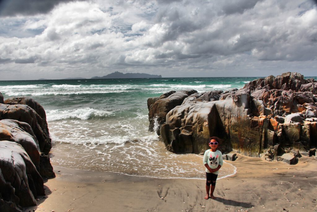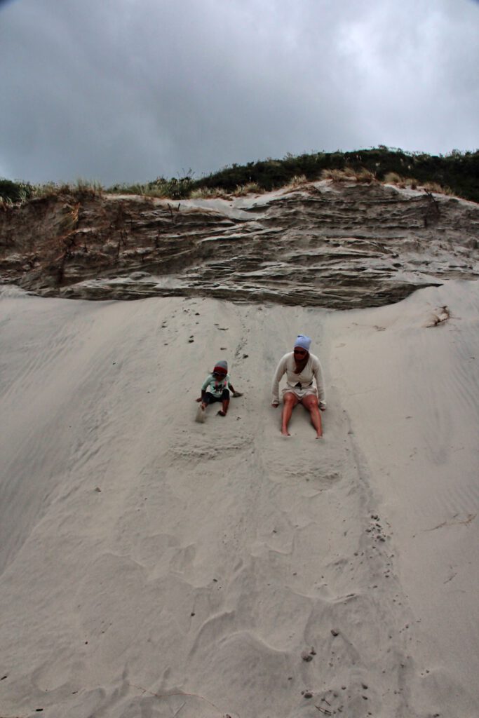 Wir hatten unsere nächste Mission also schnell gefunden: Schöne, große und ausgefallene Muscheln suchen. Nadcha war in ihrem Element – wir aber auch. Über das Muschelsuchen vergassen wir die Zeit und verbrachten so gute 3h am Strand, bis der Himmel sich zuzog und Regen ankündigte. Mit den ersten Regentropfen schlossen wir die Tür des Campers auf und fuhren zurück in Richtung Campingplatz. Dort angekommen, öffneten wir das Zahlenschloss des Gates und stellten uns zu einem anderen Camper auf den Over-Night Campground. Nach unserem Abendessen und einem ordentlichen Regenschauer, zogen wir unsere Windjacken an und machten noch einen weiteren Strandspaziergang.