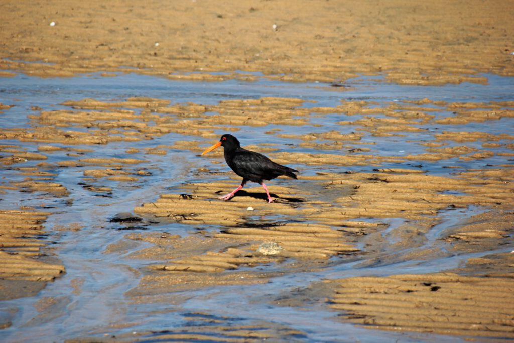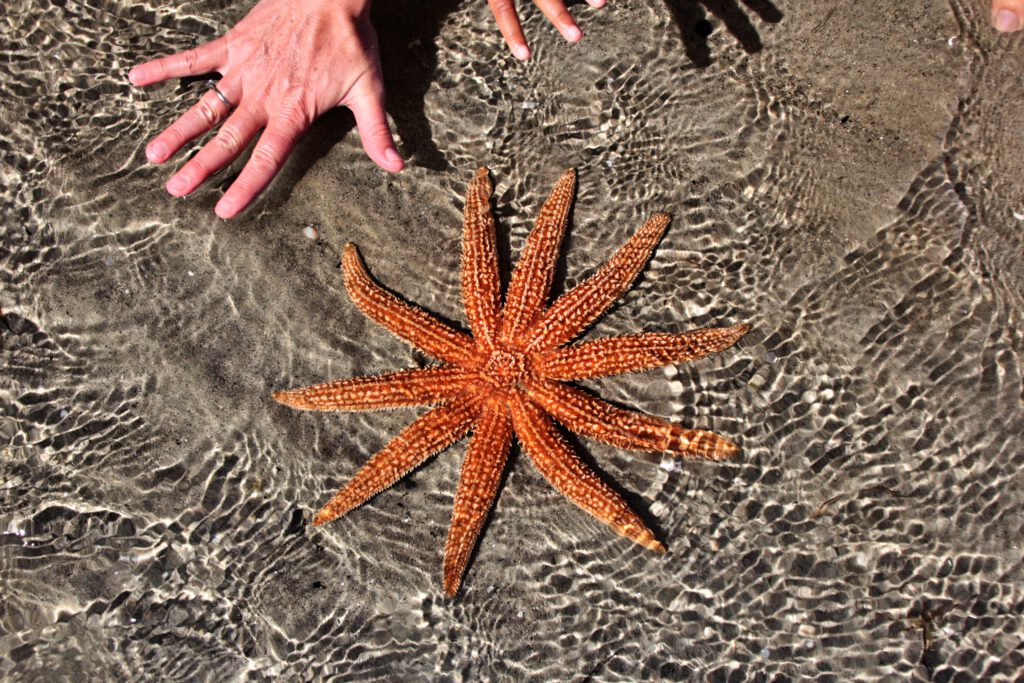 Den restlichen Nachmittag verbrachten wir am Strand direkt gegenüber unseres Campingplatzes. Die Ebbe ermöglichte es uns 300 Meter durchs „Watt“ bis zum Meer zu wandern. Dabei stießen wir auf jede Menge lebender Muscheln, Austernfischer, Einsiedlerkrebse und riesige Seesterne. Die unzähligen Algen nutze Nadcha für ihre asiatische Muschelsuppe und Seegraskuchen.