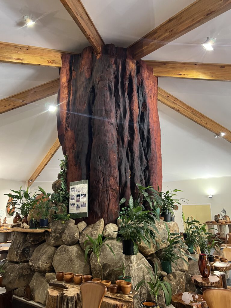 Wir verliessen den Kauriwald heute erst kurz vor Mittag und stoppten auf unserem Weg Richtung Süden schon nach wenigen Minuten. Ein Schild mit der Aufschrift – Kauri: gifts and furniture – weckte unser Interesse. Beim Eintritt fiel uns sofort ein mächtiger Kauri-Baumstamm inmitten des großen Kauri-Ladens ins Auge, der als 150.000 Jahre alt datiert wird. Wie auch einige Verkaufsstücke im Shop, wurde dieser Stamm durch die Sedimente in Mooren konserviert – kaum zu glauben. Nachdem wir uns rückversichert hatten, dass hier nur Stücke von bereits toten und nicht extra gefällten Exemplaren verkauft werden, packten wir ein Souvenir für uns ein.