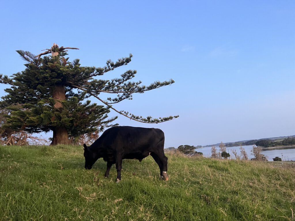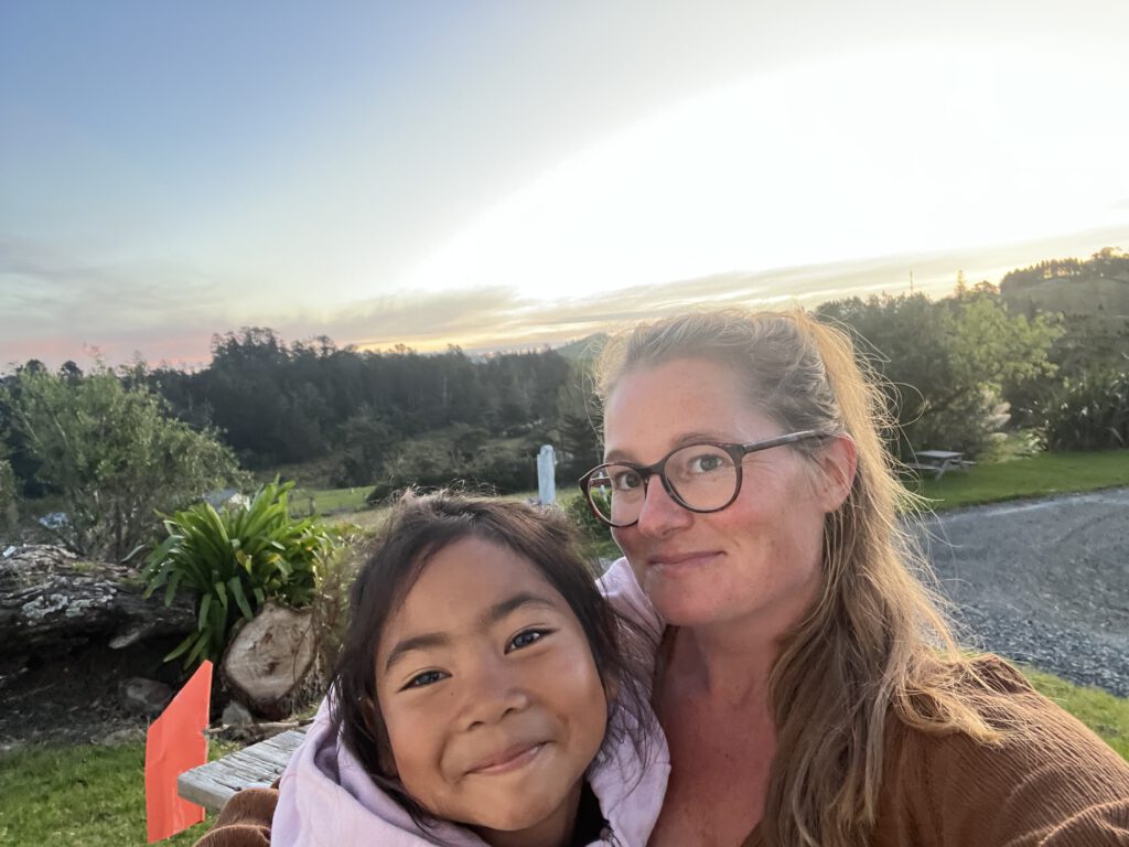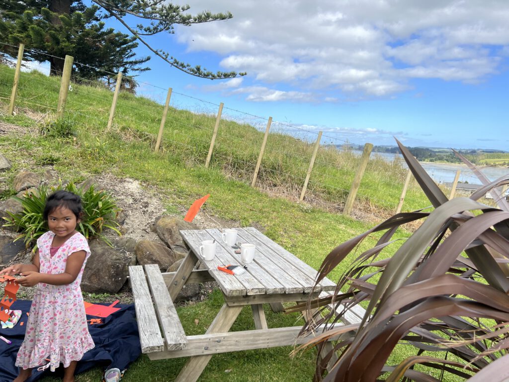 Im Anschluss fuhren wir unseren gebuchten Campingplatz in Matakohe an. Wir suchten uns einen schönen Platz mit Blick über die Bucht aus, der sich direkt neben einer Kuh- und Schafsweide befindet. Sonst gibt es vom heutigen Tag nicht viel zu berichten, denn wir begannen heute zu packen und für Tahiti benötigte Klamotten zu waschen. Nadcha vertrieb sich die Zeit mit basteln, Tierbeobachtungen sowie Hüpfen und Klettern auf dem Spielplatz.