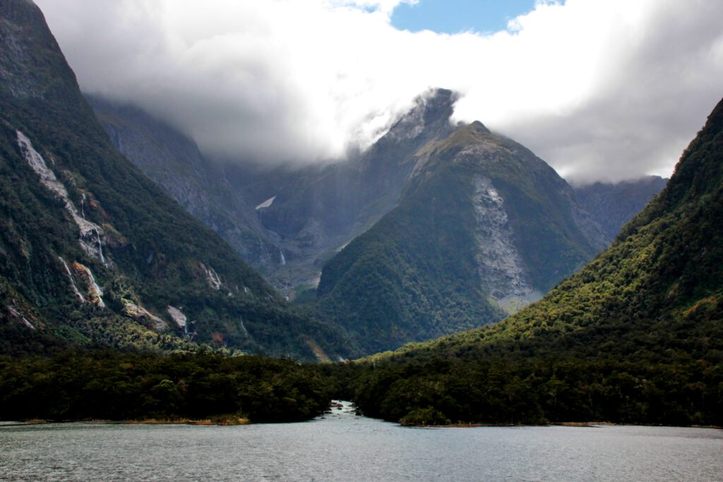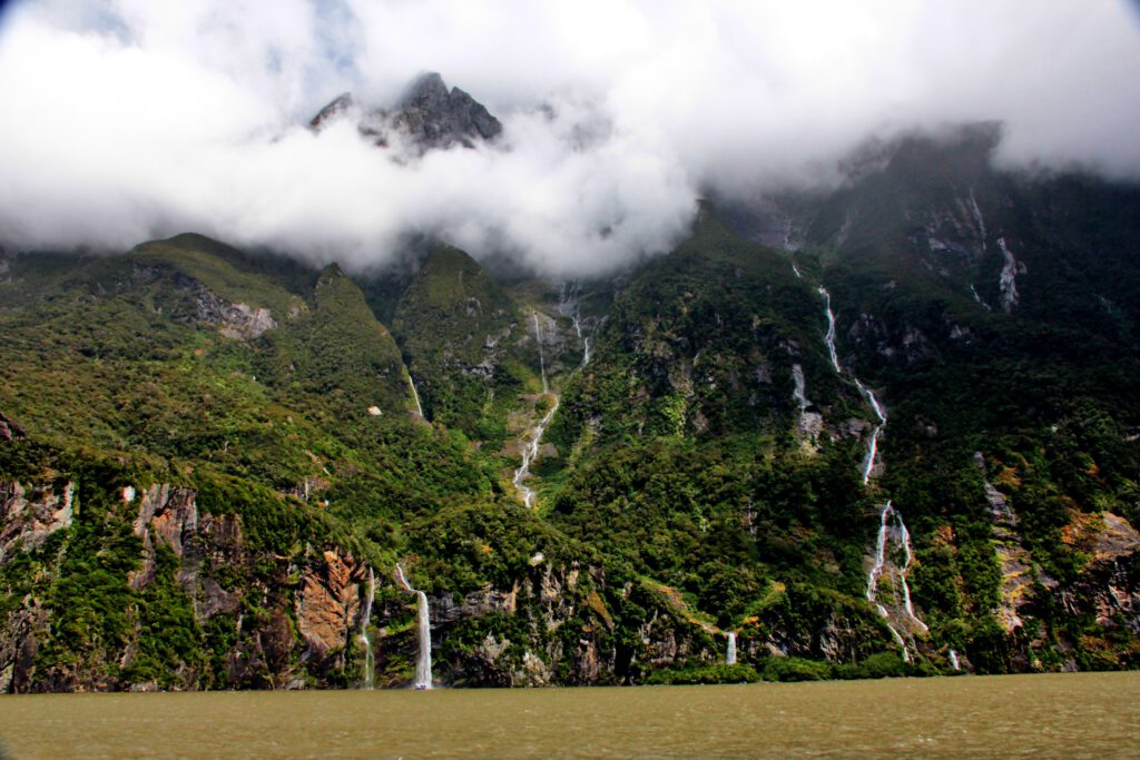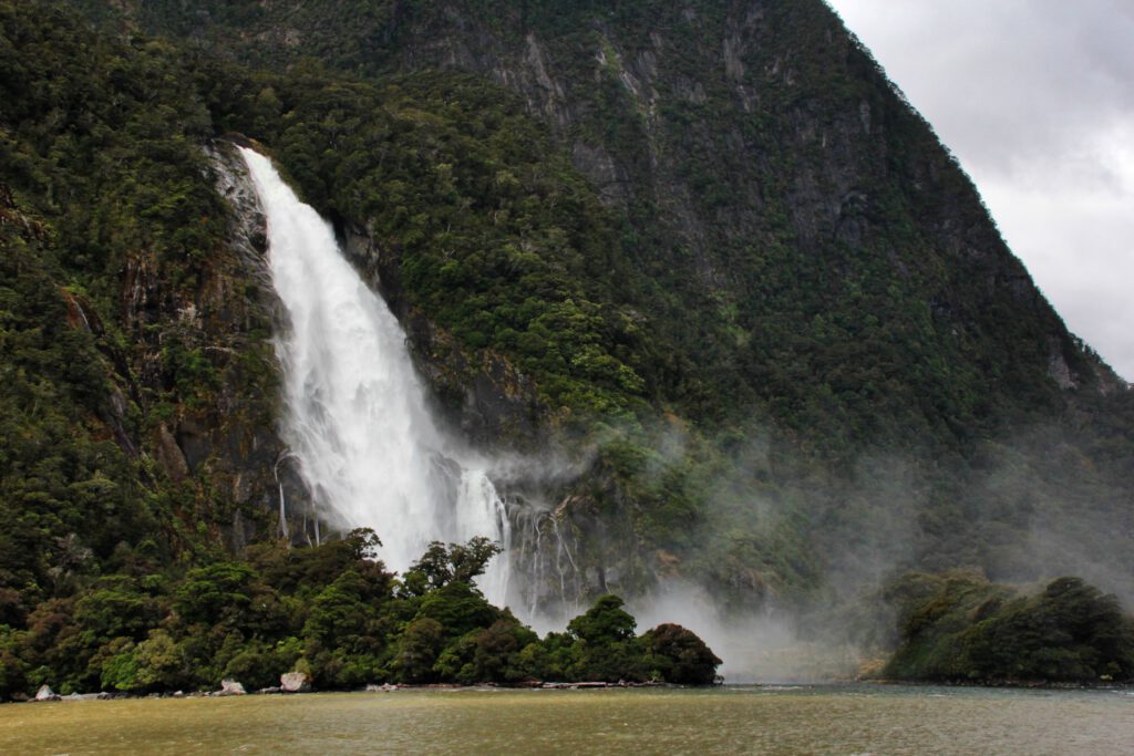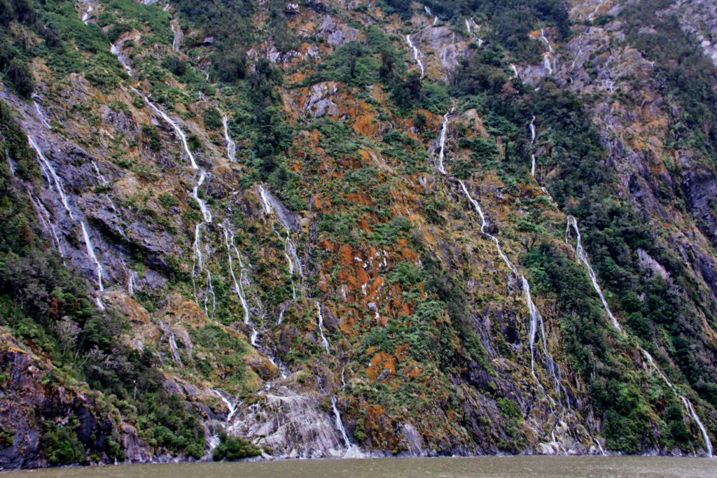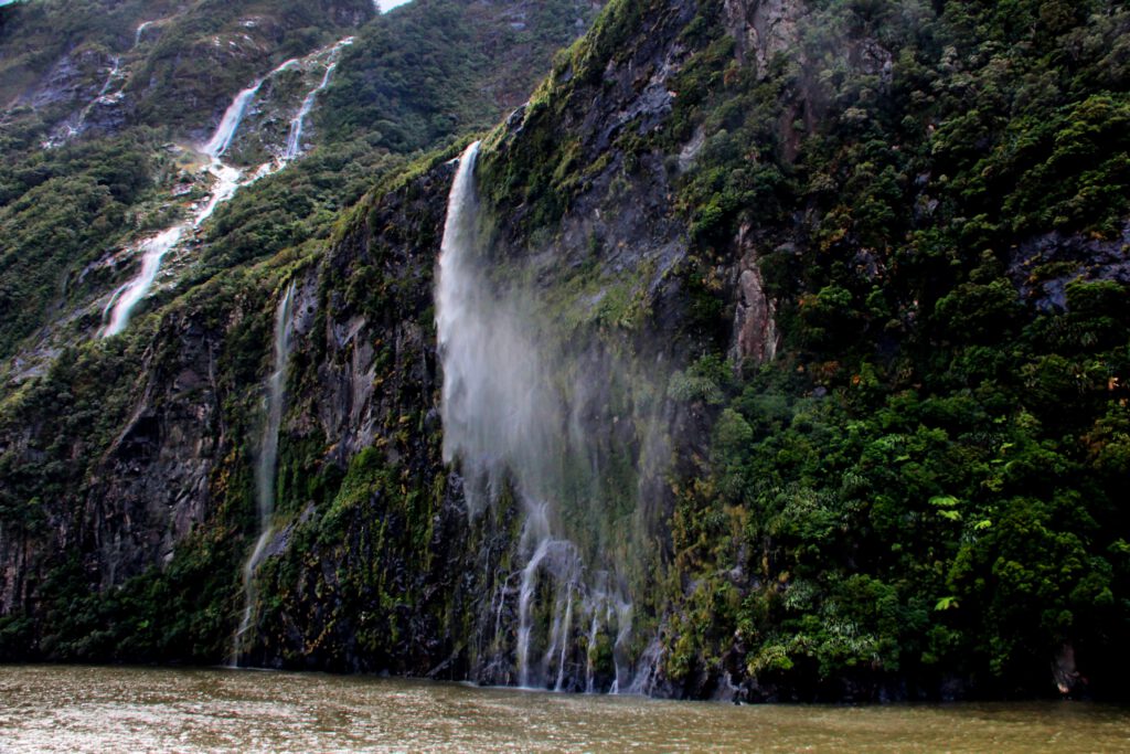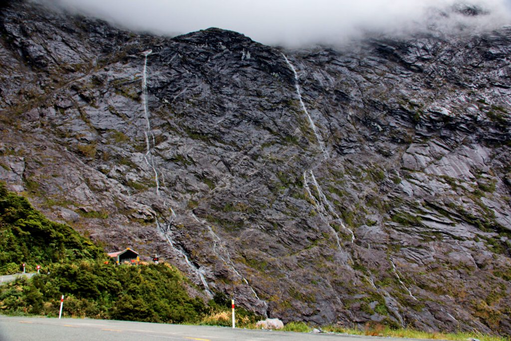 Leider war daher auf dem Hinweg zu Milford Sound die Schönheit der Gegend nur zur erahnen. Die Berggipfel waren weitestgehend in dichten Nebel- und Regenwolken verhangen. Die zahlreichen, riesigen Wasserfälle liessen erahnen welche Wassermassen heute Nacht zusammengekommen sein mussten. Rund um Milford Sound regnet es jährlich an rund 200 Tagen insgesamt 6.700 mm und damit ist diese Gegend eine der nassesten Gebiete der Welt.