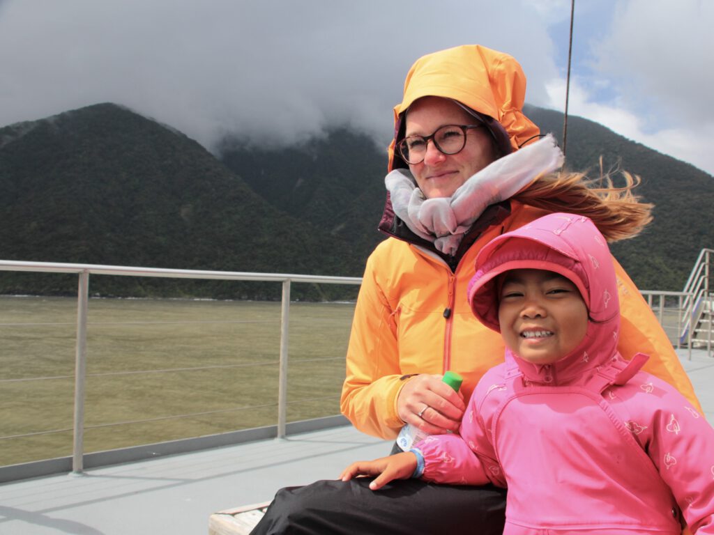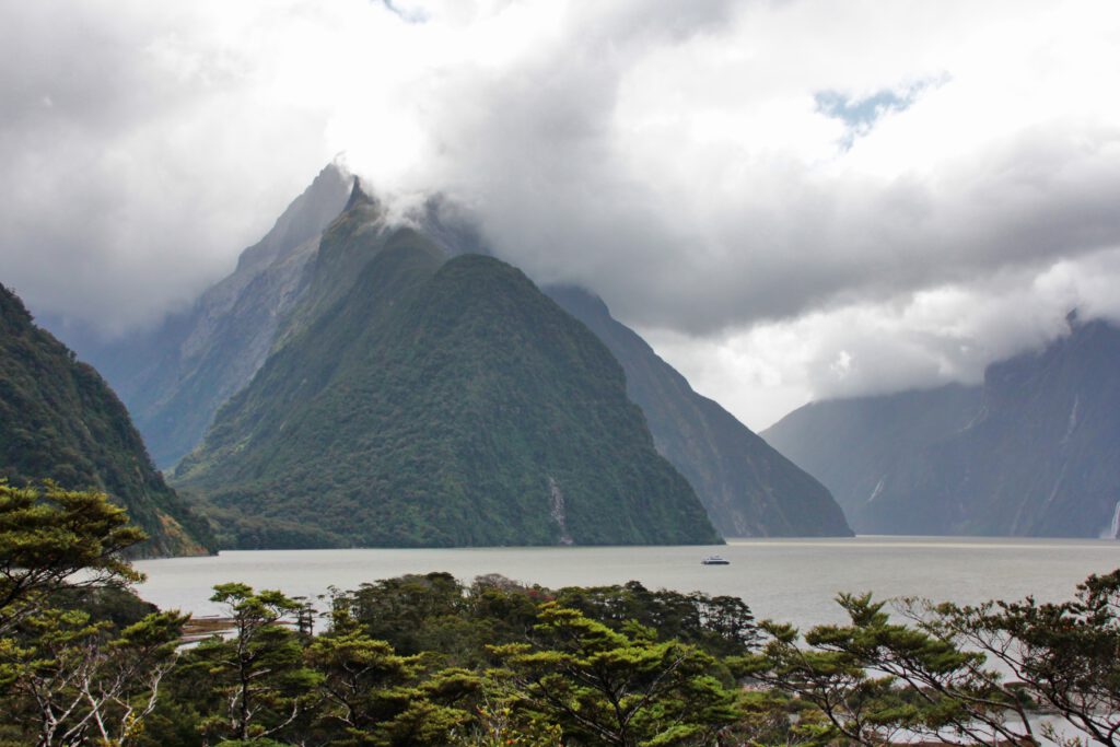 Im Anschluss an diesen kleinen Spaziergang schnappten wir unsere mit Proviant bestückten Rucksäcke und bestiegen ein riesiges Schiff, das uns auf den Milford Sound schippern sollte. Mutig setzen wir uns in Regenhosen und -jacken auf das nicht überdachte obere Deck und sollten belohnt werden. Nach weiteren 10 Minuten Nieselregen riss die Wolkendecke auf und die Sonne liess sich durch einige blaue Flecken am Himmel blicken. Die steilen, bewaldeten Berghänge wurden sichtbar und damit bestimmt über 100 Wasserfälle, die in den Sound rauschten. Das Schiff fuhr uns raus bis auf die Tasmanische See und wir genossen den Blick auf die majestätischen Steilhänge. Die gesamten Steinhänge sind von Bäumen und Farnen bewachsen. Nur an manchen Stellen ist der blanke Fels zu sehen. Dies sind Stellen, an denen es Steinrutsche gab, die alles Grün mit sich gerissen haben.