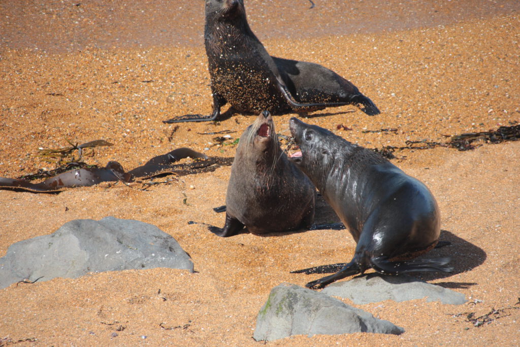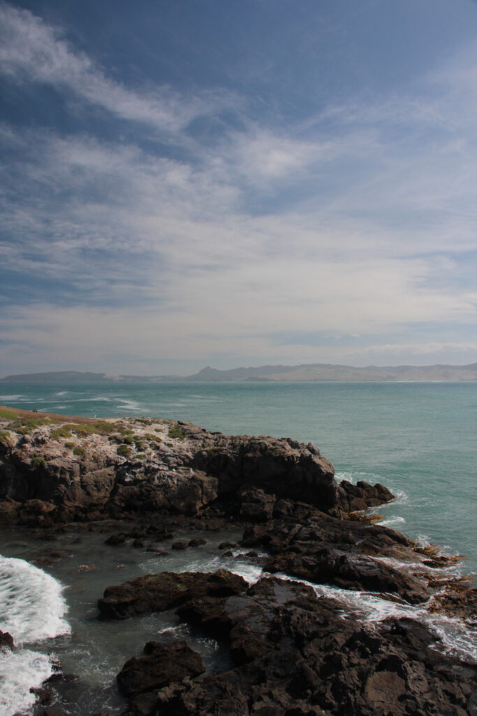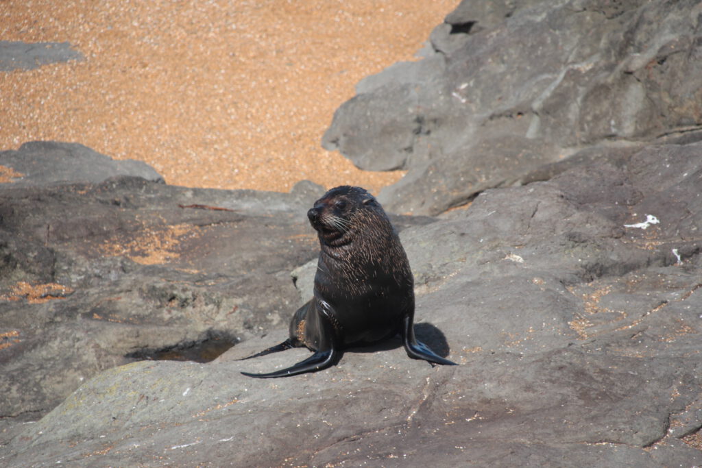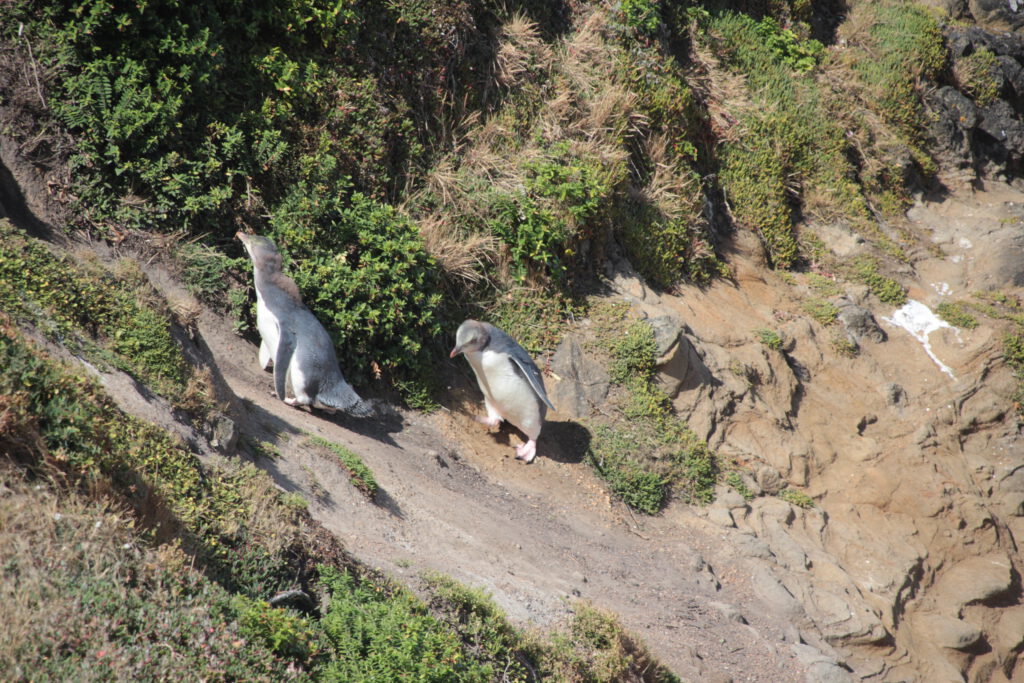 Also fuhren wir zu diesem Campingplatz, suchten uns einen schönen Stellplatz inklusive Blick aufs Meer aus und fuhren zum Leuchtturm. Ein Schild machte uns darauf aufmerksam, dass dieses Naturschutzgebiet durch die Maori verwaltet wird. Auf dem kurzen Spazierweg erwarteten uns traumhafte Blicke auf die Felsenküste. Und es dauert auch nicht lange, bis wir die ersten Pinguine entdeckten. Drei Tiere watschelten an einigen Felsen umher, dann wieder runter zum Strand und wieder nach oben. Es dauerte etwas bis wir verstanden warum die Tiere es so eilig hatten. Die Jungtiere warteten oben auf den Felsen, geschützt vor Fressfeinden, auf ihre Eltern und Essenlieferanten. Und die Eltern-Pinguine hatten mit diesen Fischlieferungen jede Menge zu tun. Wir setzen uns ins Gras und beobachteten das Treiben sehr lange und ausgiebig. Als wir die Landzunge weiter entlang liefen, konnten wir zudem hunderte Robben beobachten, die im Wasser jagten, um den besten Platz auf den Felsen kämpften oder einfach nur faul rumlagen und schliefen. Wir genossen die Zeit sehr und machten uns spät auf den Rückweg zum Campingplatz.