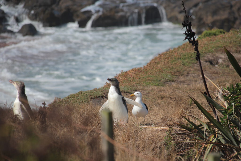Zurück am Camper bekam Nadcha großen Hunger und ich nutze die kurze Essenspause, um in unseren diversen Heftchen, Karten und Wanderbroschüren zu lesen. Dabei fand ich heraus, dass die angedachte Pinguinsichtung erneut in Hafennähe von Oamaru und auch noch kostenpflichtig angeboten wird. Also eigentlich wollen wir die Tiere lieber in unbebauter und idyllischer Natur erleben und nicht neben Schiffsanlegern. Wir waren uns einig, wir müssen umplanen. Die weitere Recherche machte uns dann auf einen Campingplatz 30km weiter südlich aufmerksam und auf einen Leuchtturm nahe Moeraki. Hier soll man Gelbaugenpinguine in freier Natur beobachten können, die gefährdetste aller Pinguinarten.
