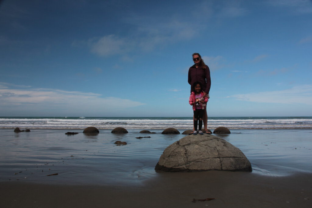 Vorher fuhren wir jedoch noch einmal Richtung Strand und schauten uns eine der bekanntesten Touri Attraktionen Neuseelands an. Die Moeraki Boulders. Diese Steinkugeln wirken, als hätte ein Kugelstoßer diese an den Strand „geworfen“. In allen Größen liegen die Kugeln am Strand verteilt und wurden von der herankommenden Flut umspült. Wirklich ein wunderschöner und besonderer Ort.