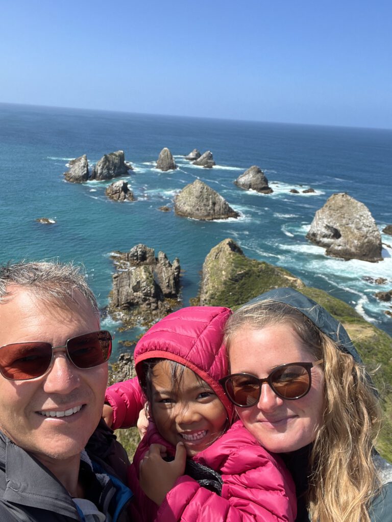 Dann erreichten wir Nugget Point. Dort steht auf einer Felszunge ein Leuchtturm, umgeben von zahlreichen Felseninseln, die laut James Cook wie Goldnuggets aussehen sollen. Wir fanden zwar, dass sie einfach wie normale Steine aussehen, aber der Ausblick war trotzdem eine Wucht. Und wir konnten von der äußersten Spitze der Felszunge zahlreiche Robben von oben sichten.
