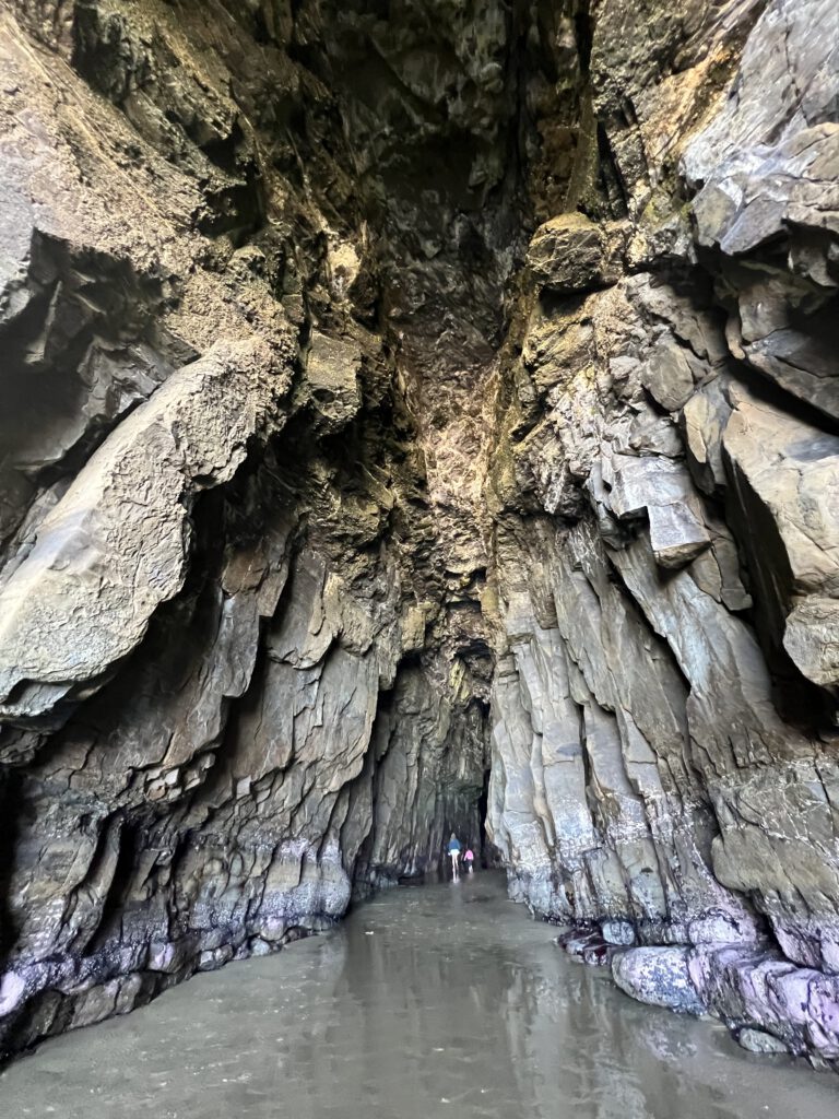 In unserem „Die besten Wanderungen auf der Südinsel“ Reiseführer wurde eine Wanderung ganz in der Nähe aufgeführt, die jedoch nur 1,5 Stunden vor und nach Ebbe gemacht werden kann – die Cathedral Caves. Also schauten wir nach und siehe da, wir hatten Glück – die Tiden Tabelle gab grünes Licht. Kurz vorm Ziel kamen wir uns jedoch vor wie an einem Samstag auf dem Parkplatz bei IKEA. Auf der Schotterpiste ging nur seehhr langsam voran und bald zeigte sich warum. Für diese Wanderung war ein kleiner Obolus zu verrichten, der von einem Mann in einem kleinen Häuschen eingesammelt wurde. Und der hatte die Ruhe weg trotz einer laaangen Autoschlange. Als wir endlich vorne am Häuschen ankamen, erzählte der gute Mann seelenruhig von seinen Kindern und davon wie schön die Zeit doch war als die Kinder noch klein waren. Dass er uns nicht noch auf einen Tee in sein Häuschen eingeladen hat, war schon fast verwunderlich. Endlich erhielten wir das Ticket und einen Parkplatz für unser Schiff. Wir wurden noch darauf hingewiesen, dass wir in 75 Minuten wieder am Parkplatz angekommen sein müssen, denn dann schließt er das Tor. Aha – gut dass der Mann nicht noch Geschichten aus seiner Jugend zum Besten gab -sonst wäre es echt knapp geworden.